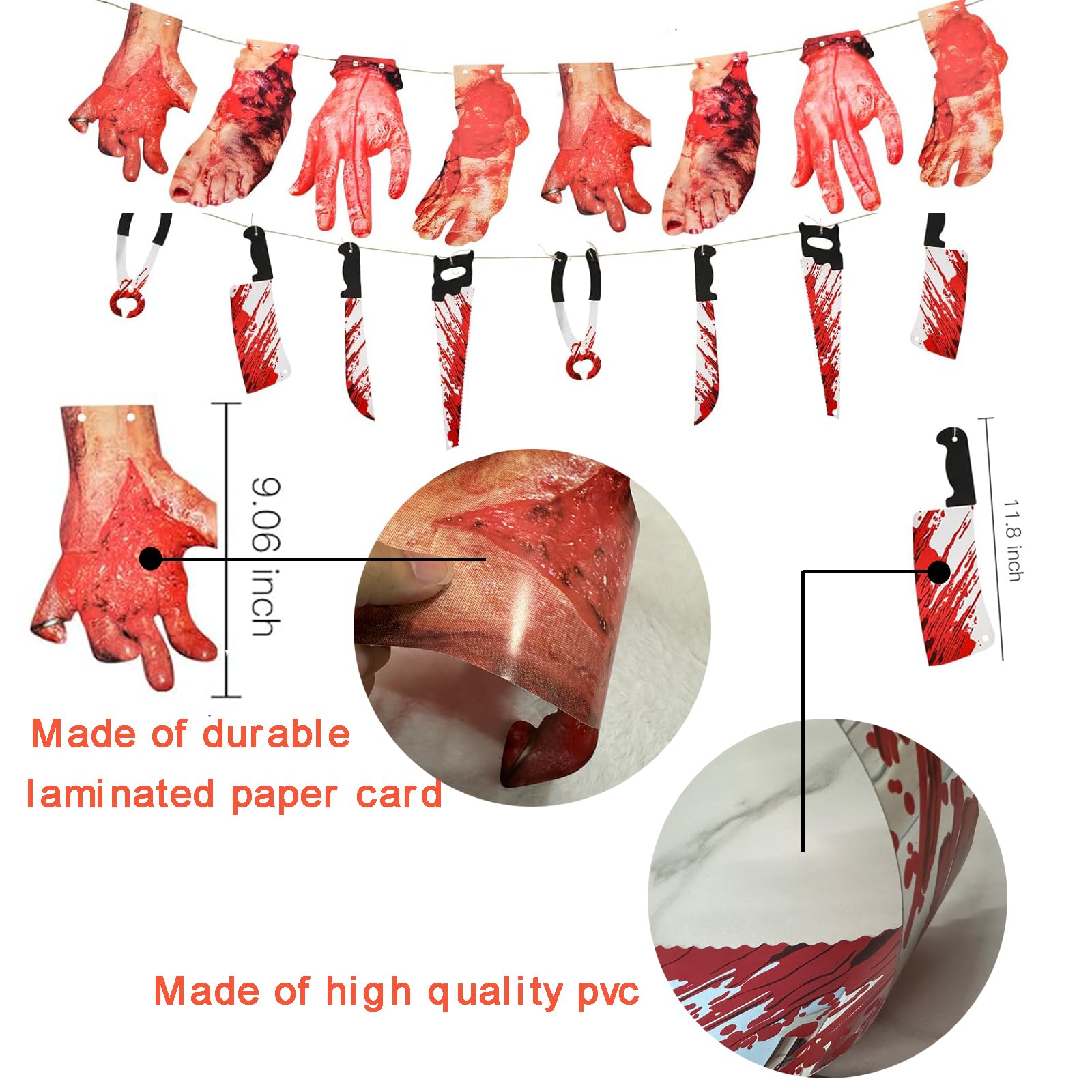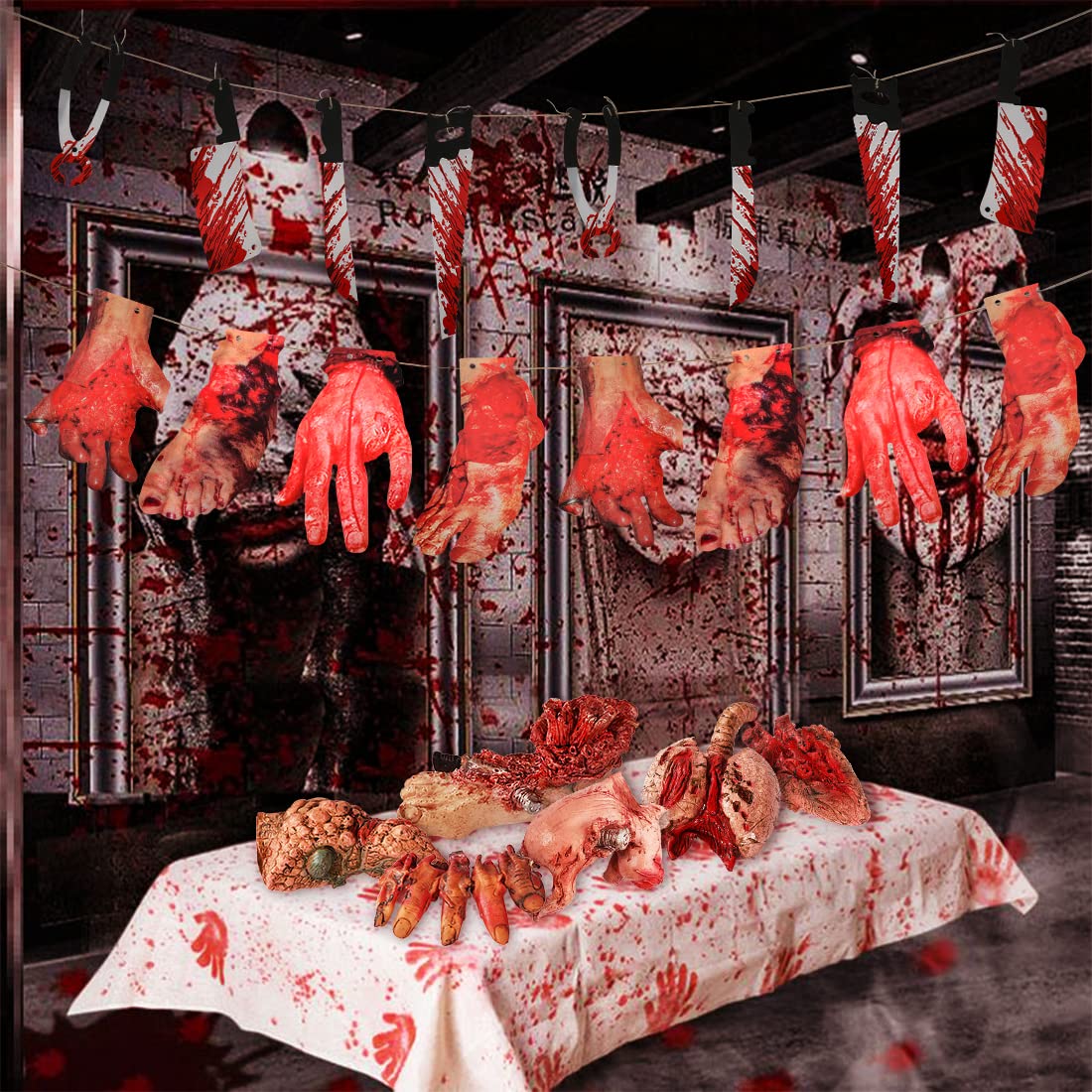 MATERIAL: The fake body parts are made of premium soft Latex & Environmental protection PP cotton fabric, featuring realistic and bloody human organs design. The weapons banner are made of high quality pvc, the body parts banner are made of high quality paper card.