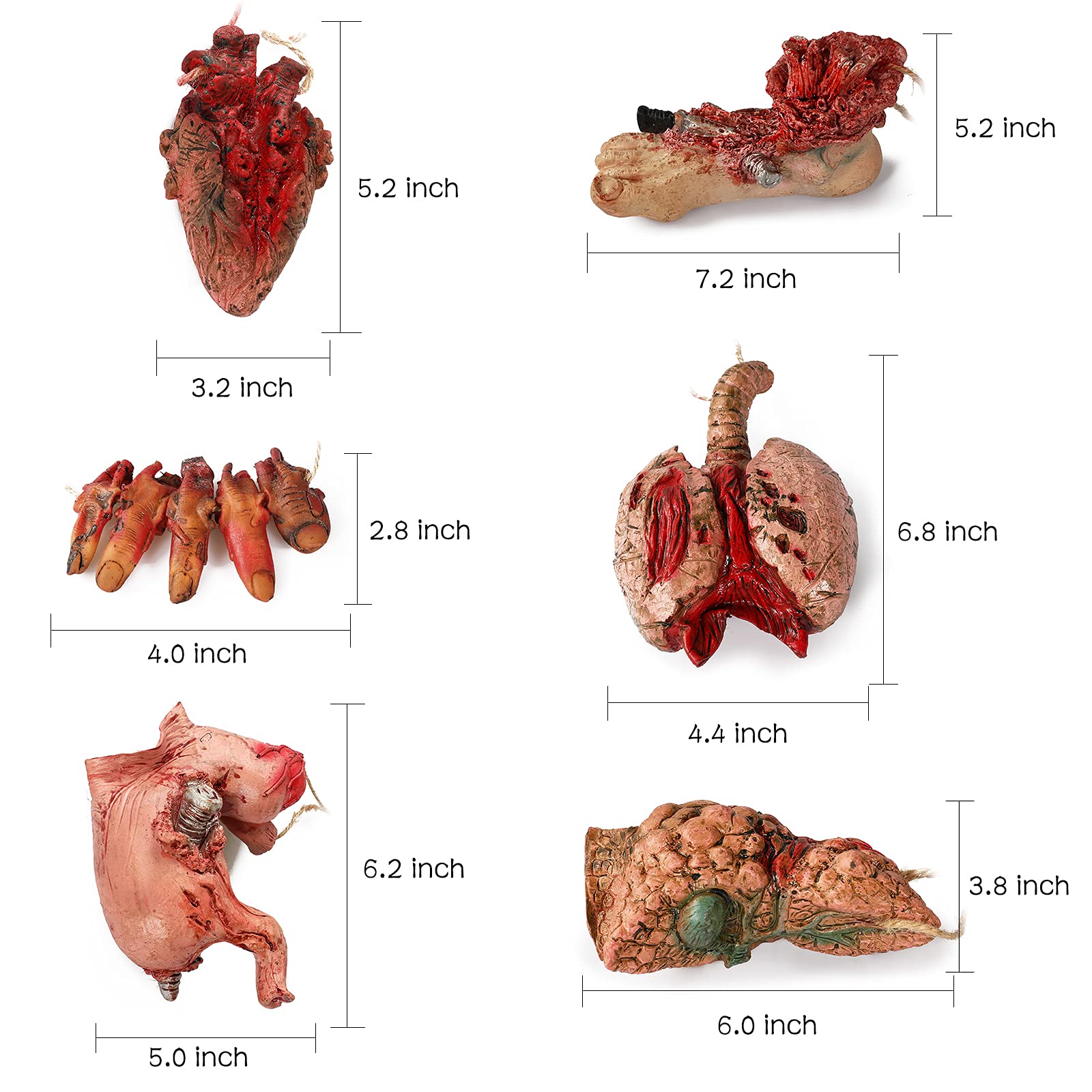 PACKAGE INCLUDED: 1 fake heart, 1 fake liver, 1 fake stomach, 1 fake lungs, 1 fake feet, 1 fake fingers, 8 pcs body parts paper card hanging banner, 8 pcs weapons hanging banner.