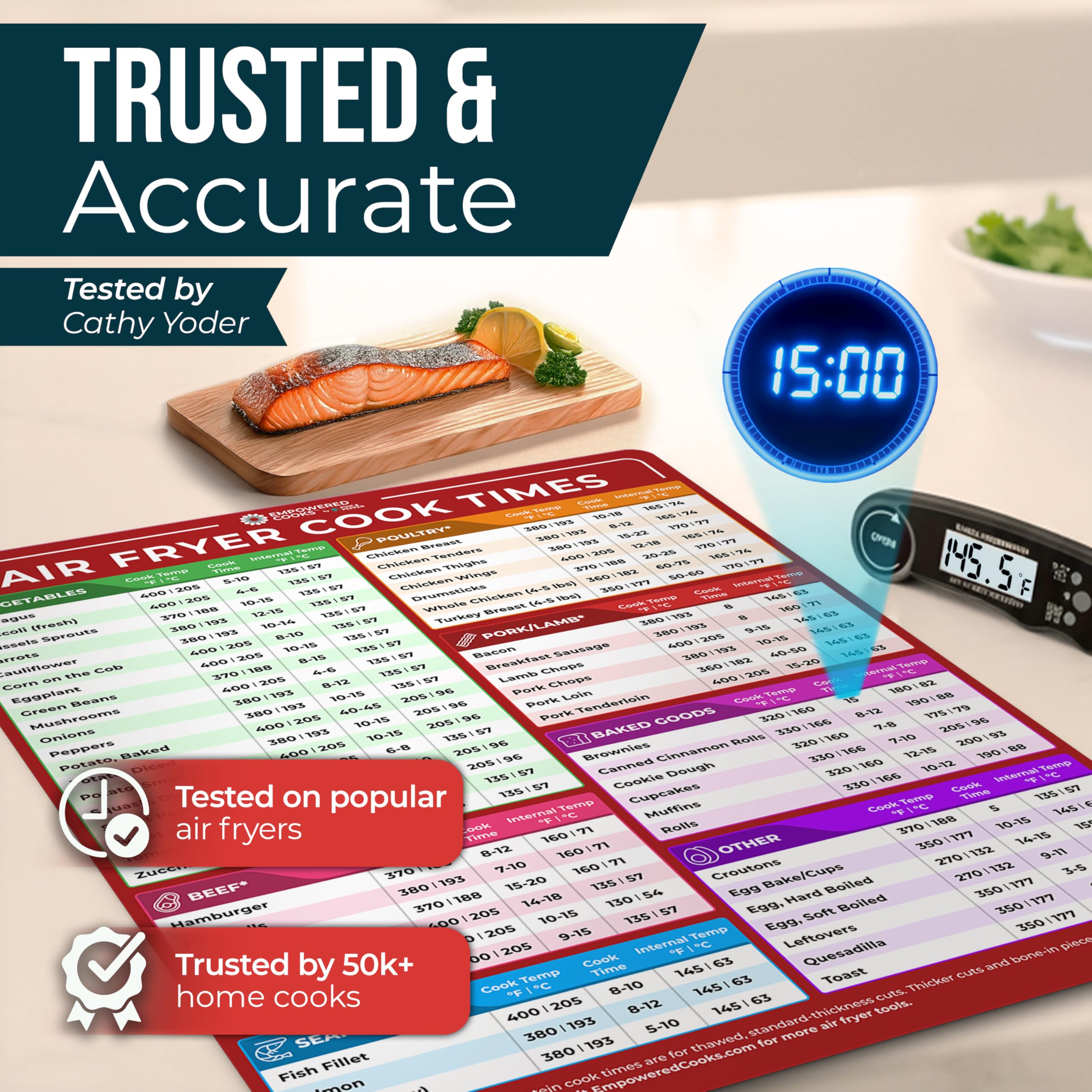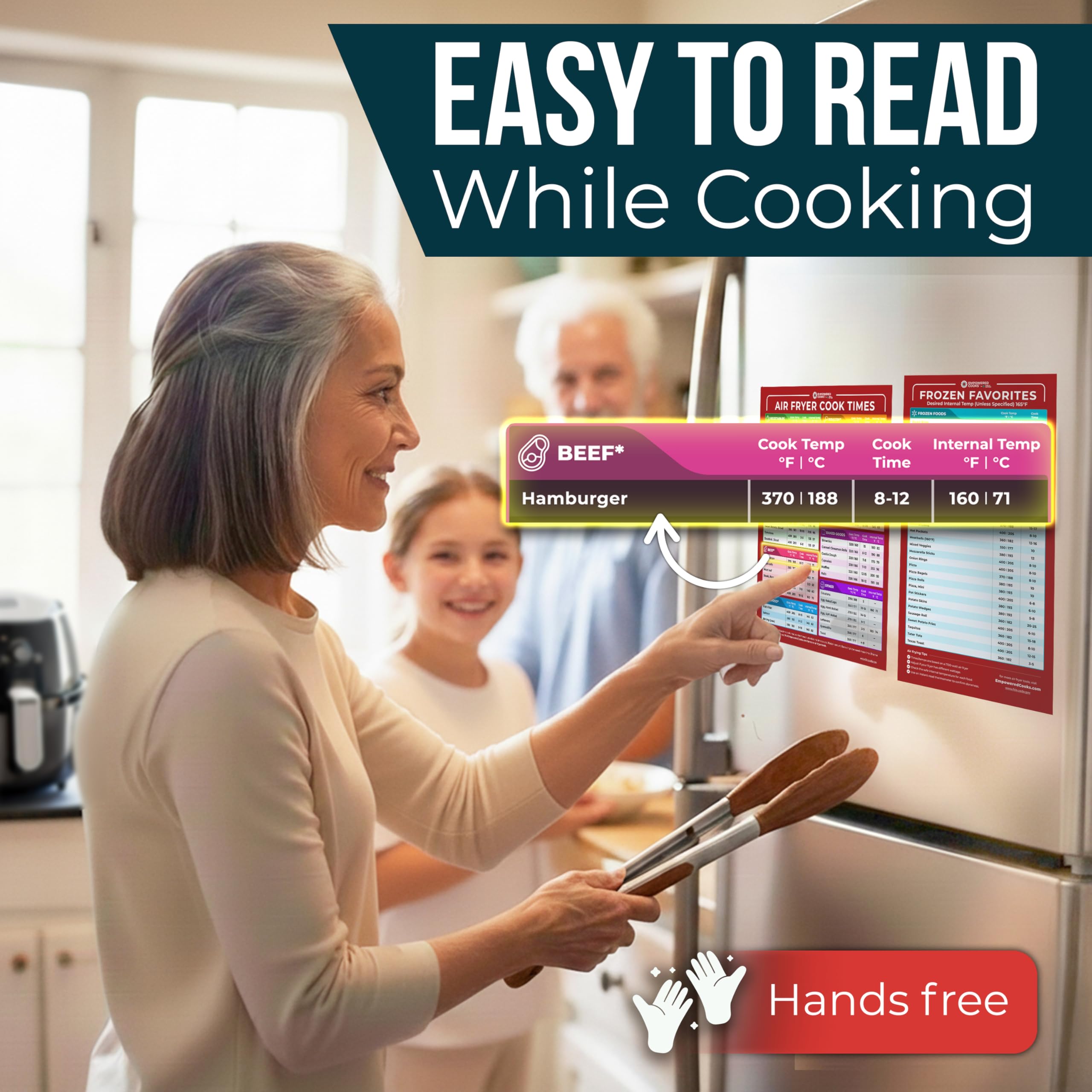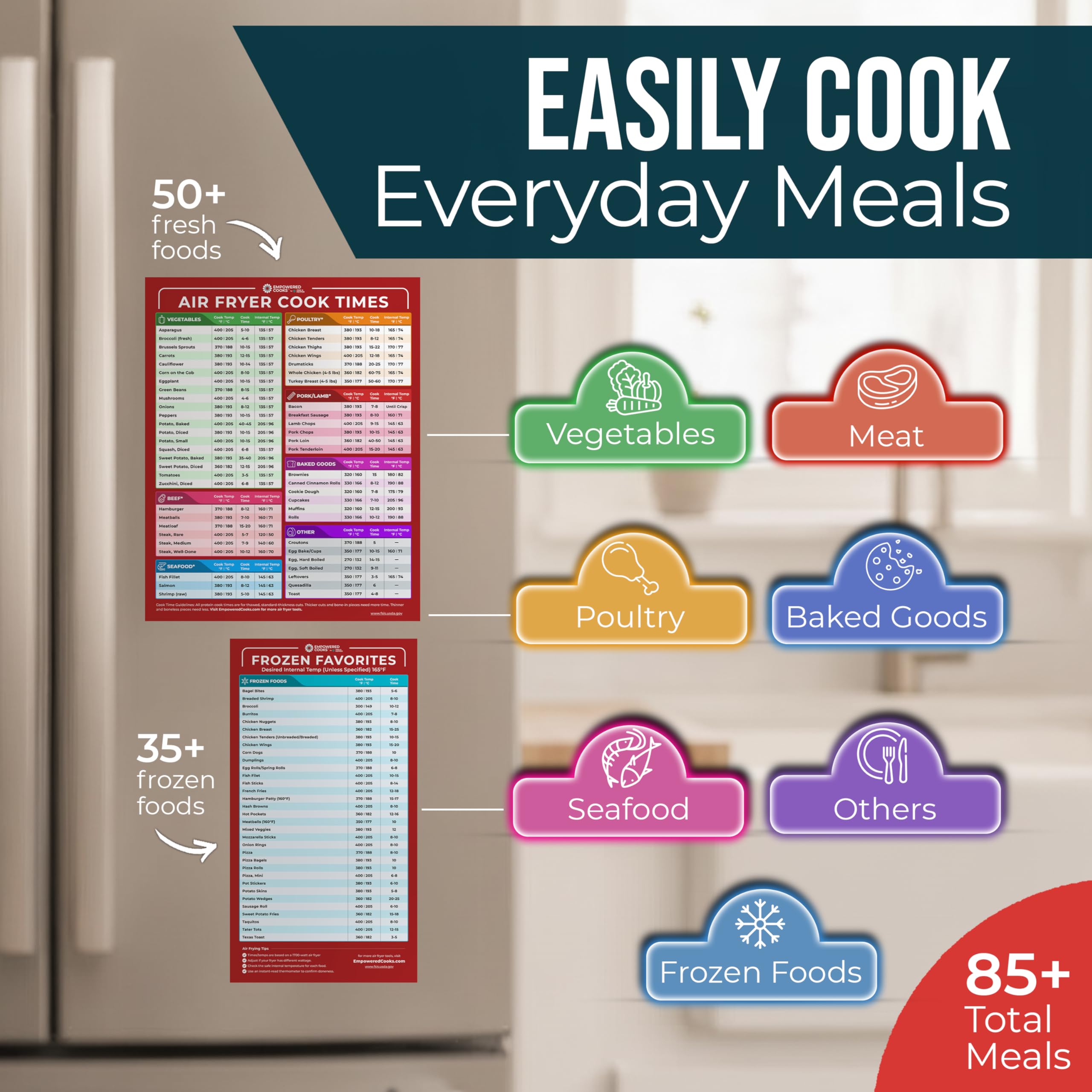 Convenient Magnetic Cheat Sheet: This air fryer cheat sheet magnet cooking guide booklet attaches securely to your fridge or other metal surfaces, providing fast access to essential cooking details. It’s a great air fryer cheat sheet that ensures you never miss key temperatures and times while cooking your favorite dishes.