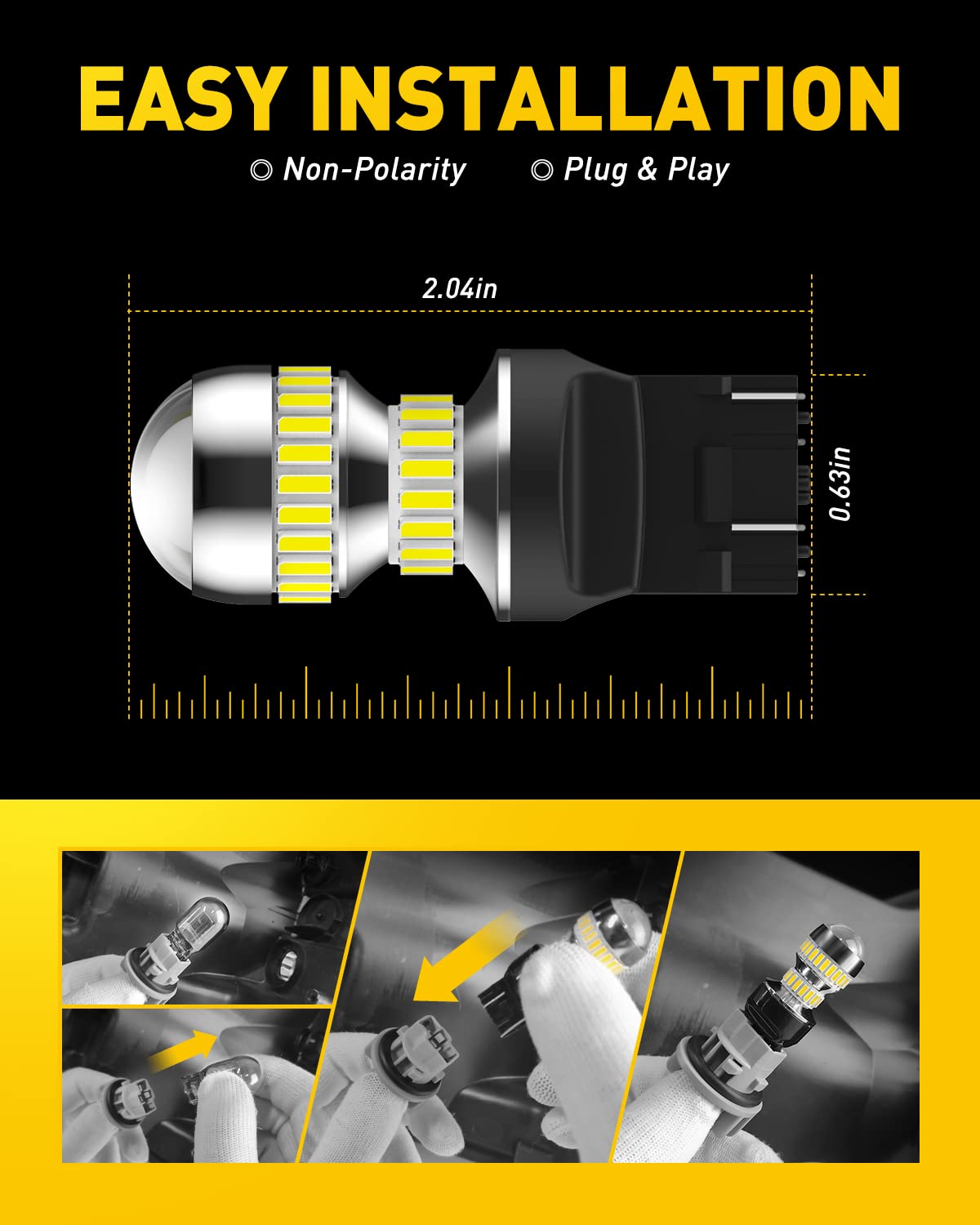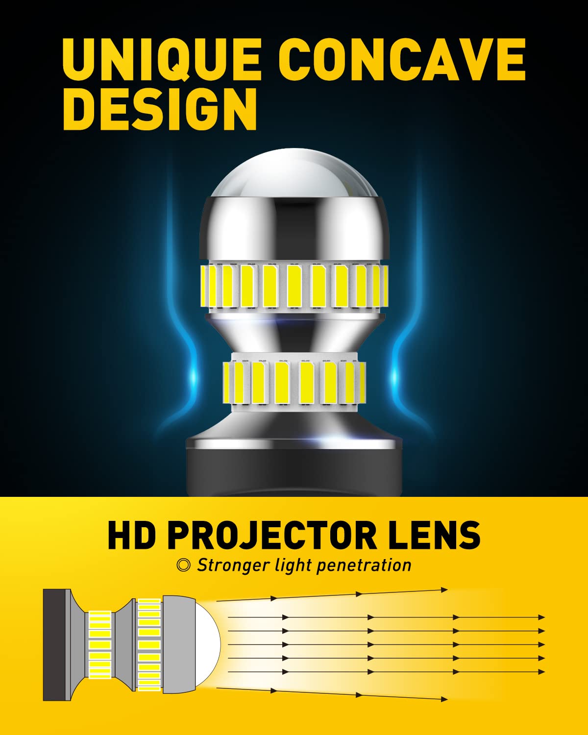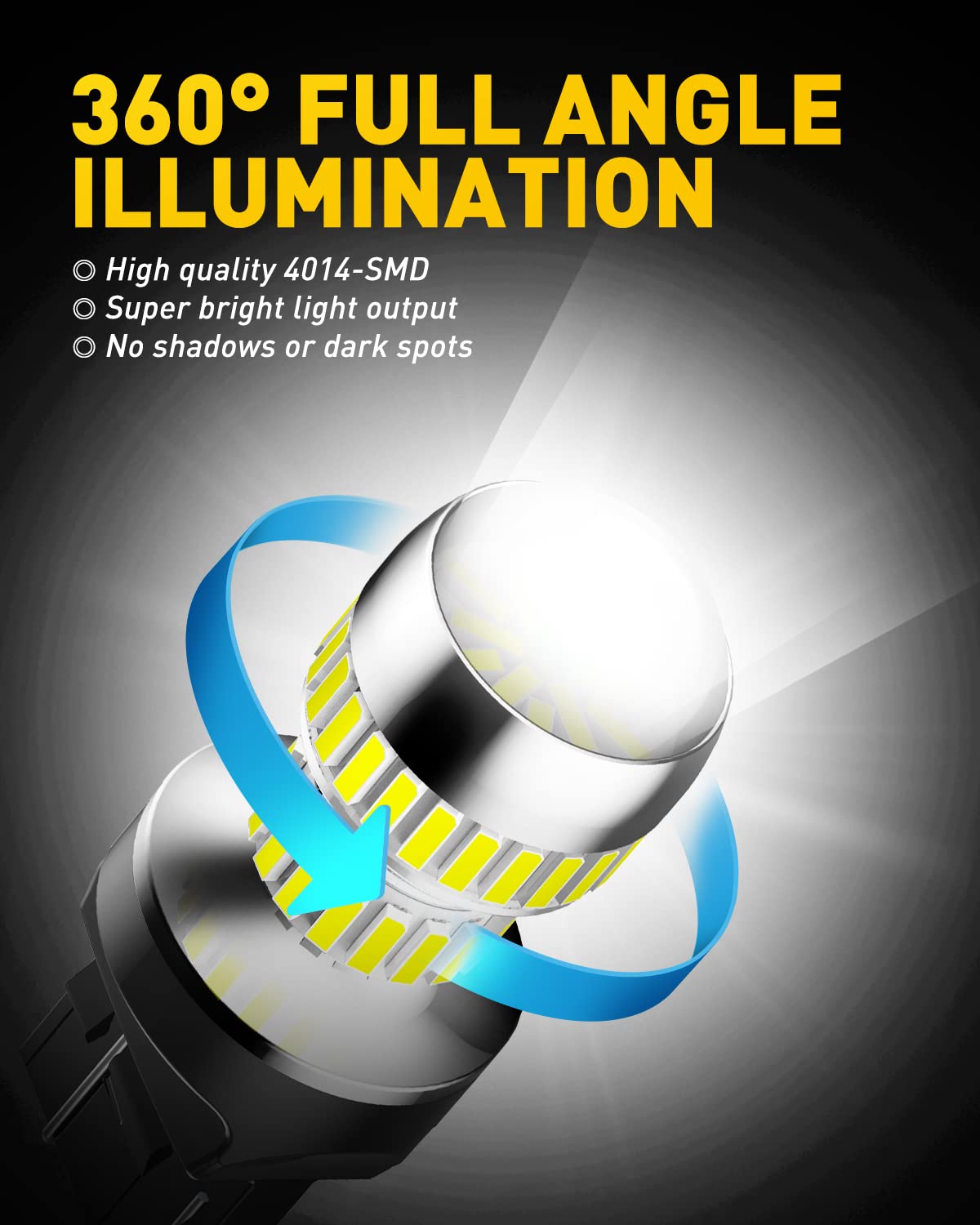 Resembling halogen bulb shape design and sequencing 54 4014-SMD LED chips precisely around the bulb. Delivering 360° high luminous efficiency with full 6000K white light, see more clearly and safely when reversing