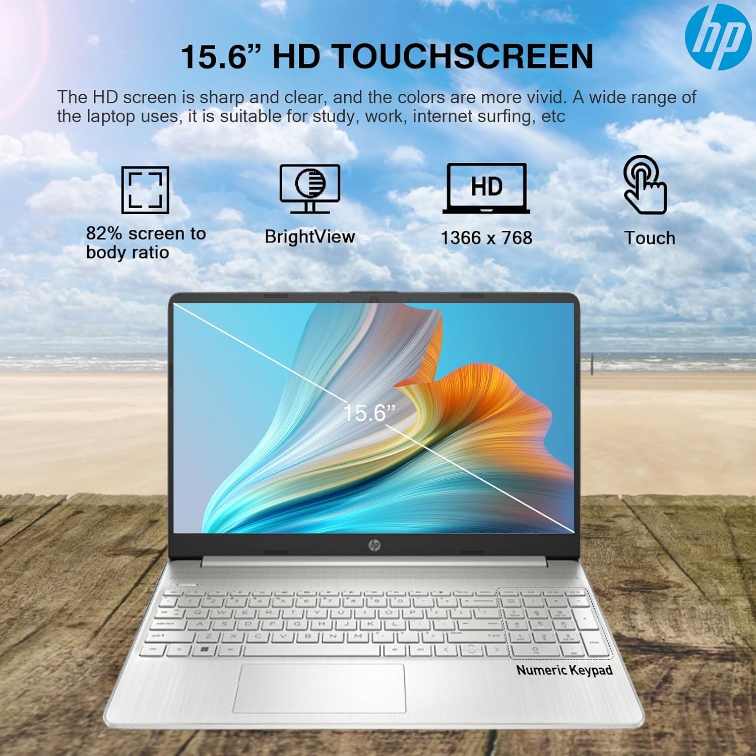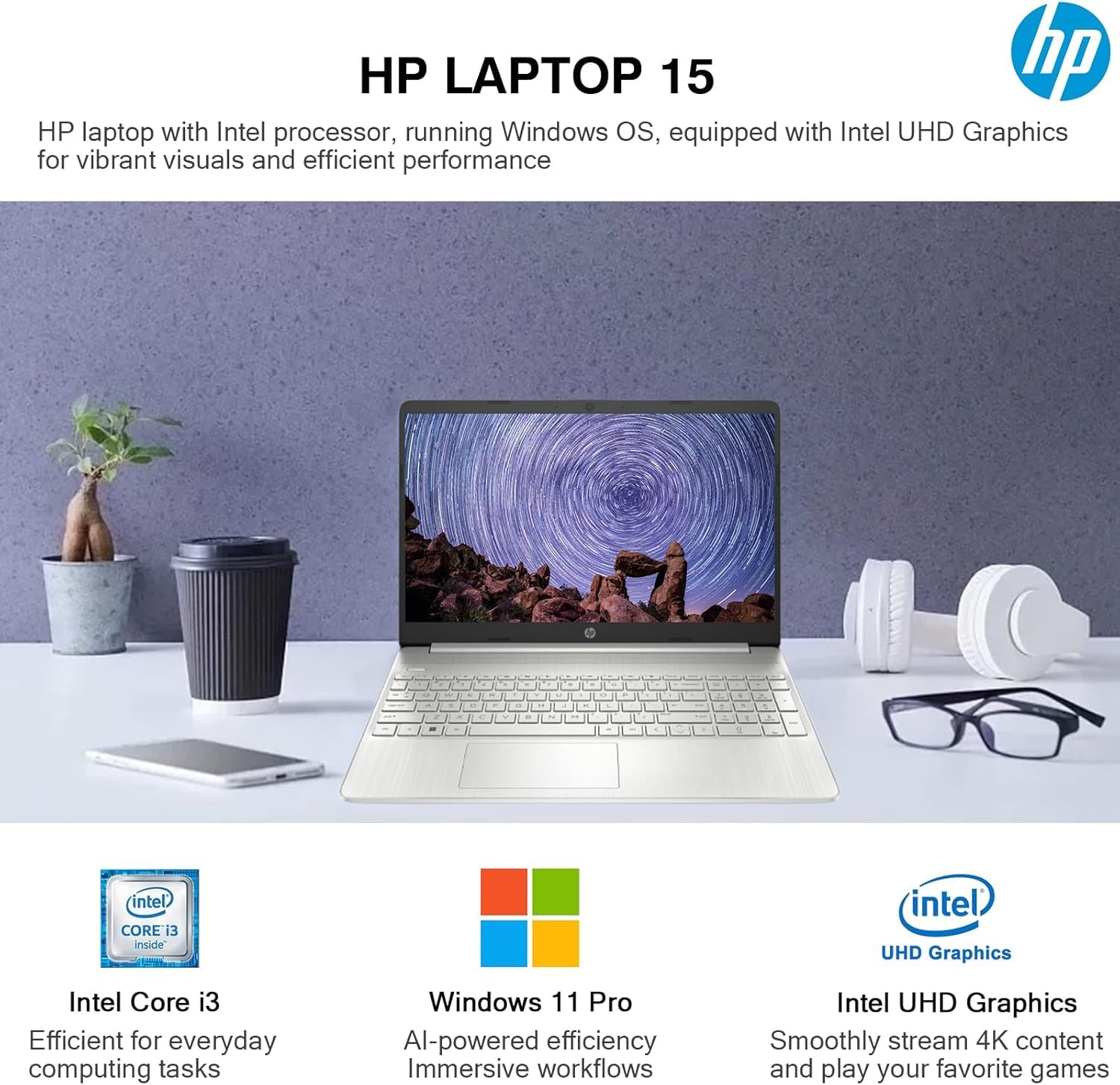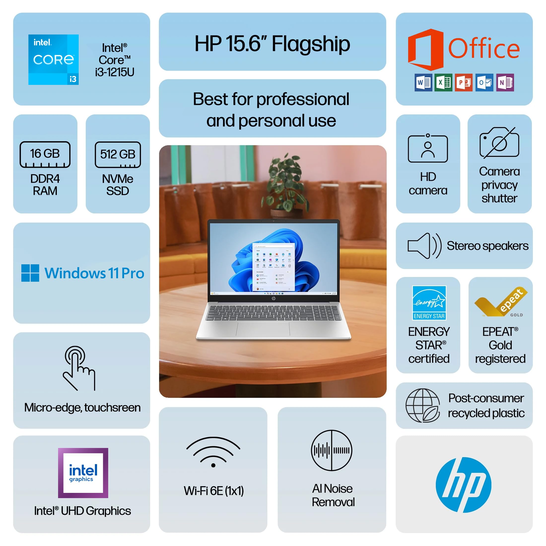 Power to do what matters most. The HP 15.6 inch Laptop PC combines the reliable processing power of an Intel i3 processor, ample storage, and powerful graphics, giving you the power and capacity to do more. With a thin and light design, take this PC anywhere. Do more with a micro-edge HD display and enjoy vivid and flicker-free images. Processor: Intel Core i3-1215U (Up to 4.4 GHz Max Boost Clock, 10 MB L3 Cache, 6 cores, 8 threads) Graphics: Intel UHD Graphics Display: 15.6-inch diagonal, HD (1366 x 768), touch, micro-edge, BrightView Operating system: Windows 11 Pro Software: Free Lifetime Microsoft Office Memory: 16 GB DDR4-3200 MT/s RAM Storage: 1TB Storage (512 GB PCIe NVMe M.2 SSD + 500 GB External Drive) Optical Drive: No Connectivity: Wi-Fi 6E and Bluetooth 5.3 combo Audio: HD Audio with stereo speakers Keyboard: Full-size, natural silver keyboard with numeric keypad Webcam: HP True Vision HD camera with privacy shutter and mic mute key Ports: 1x USB Type-C 5Gbps signaling rate (supports data transfer only) 2x USB Type-A 5Gbps signaling rate 1x HDMI 1.4b 1x Headphone/microphone combo 1x AC smart pin Battery: 3-cell, 41 Wh Li-ion battery, Up to 9 hours Color: Natural Silver Dimensions (W x D x H): 14.17 x 9.29 x 0.73 inches Weight: 3.52 lbs Accessory: HubxcelAccessory (Wireless earbuds, USB extension cord, HDMI cable, mouse pad, wireless mouse, and 500GB external hard drive.)