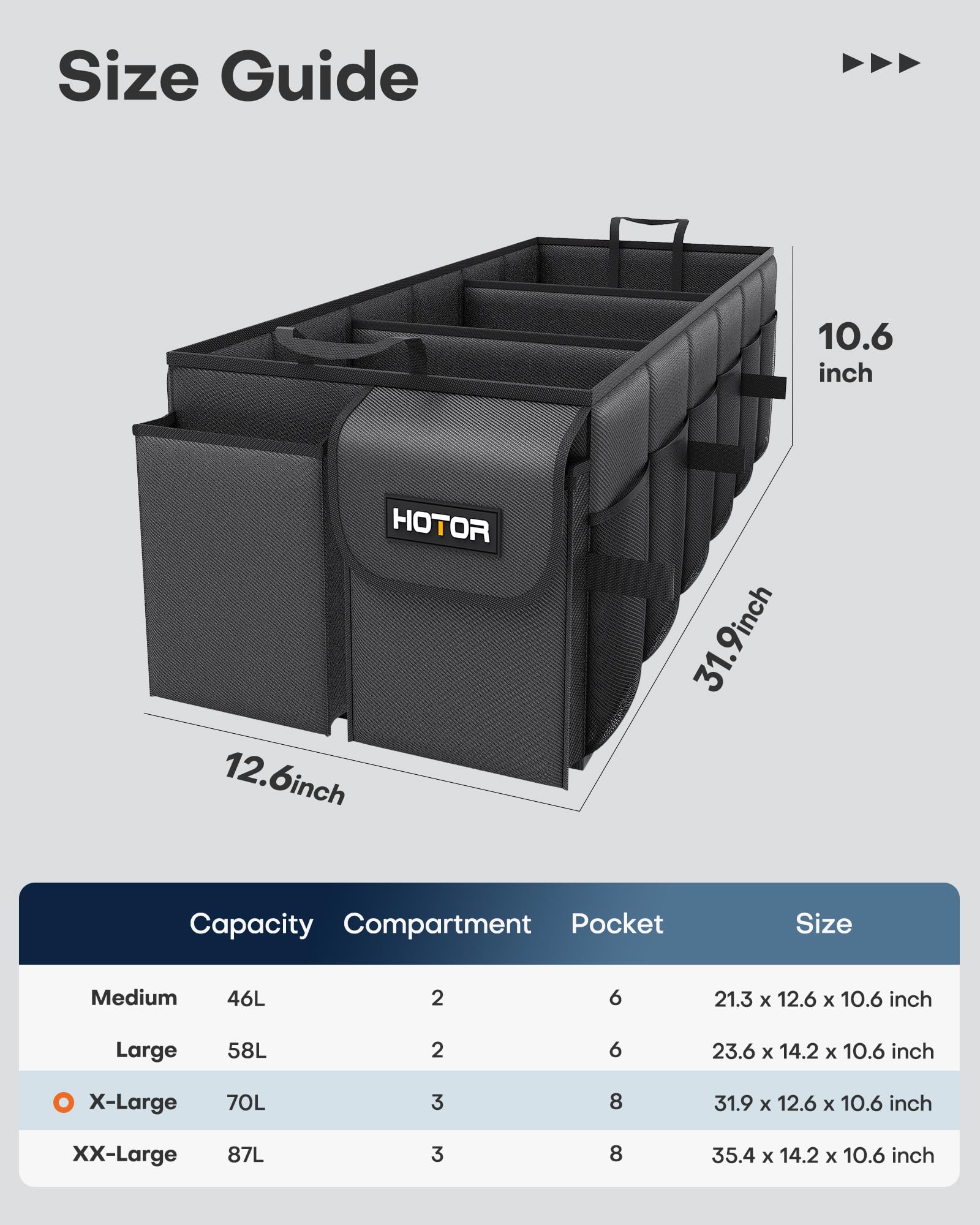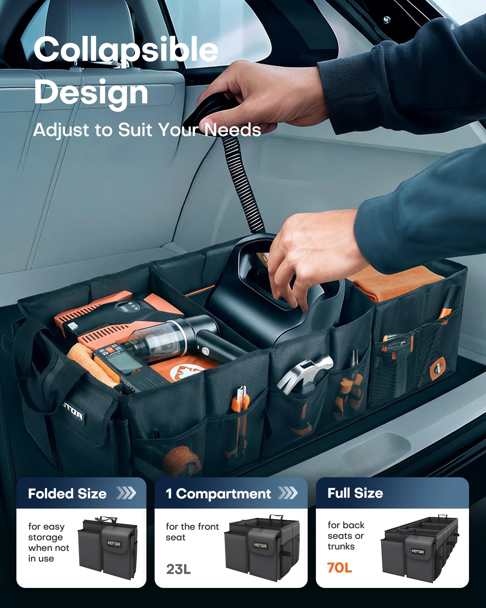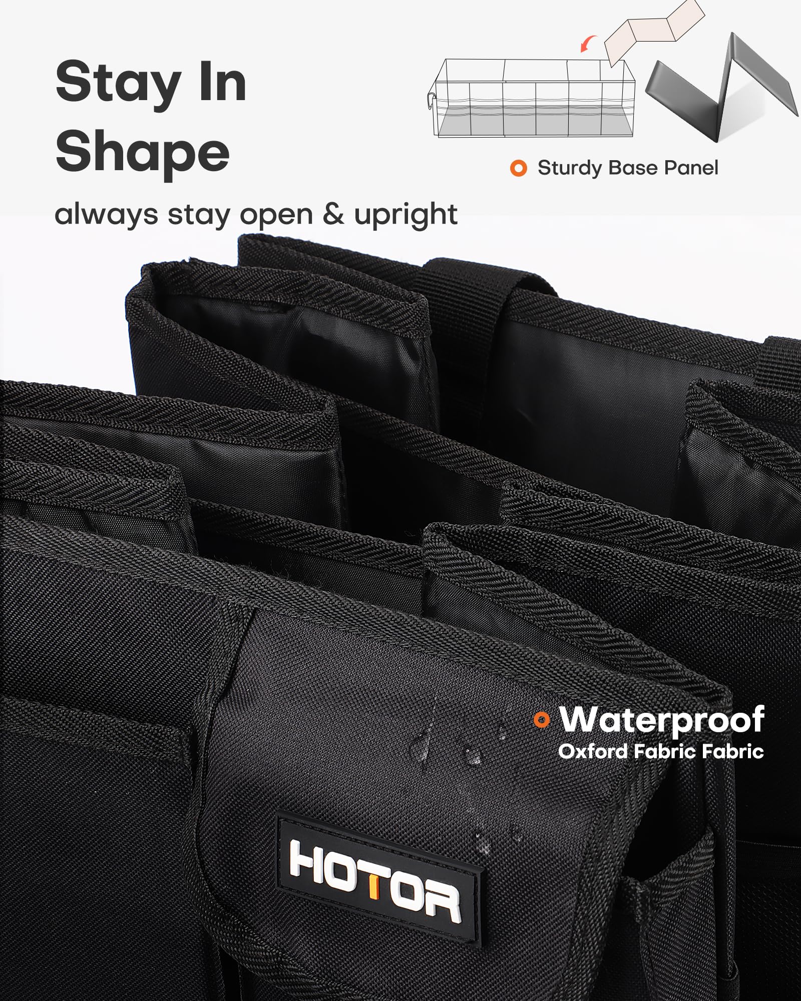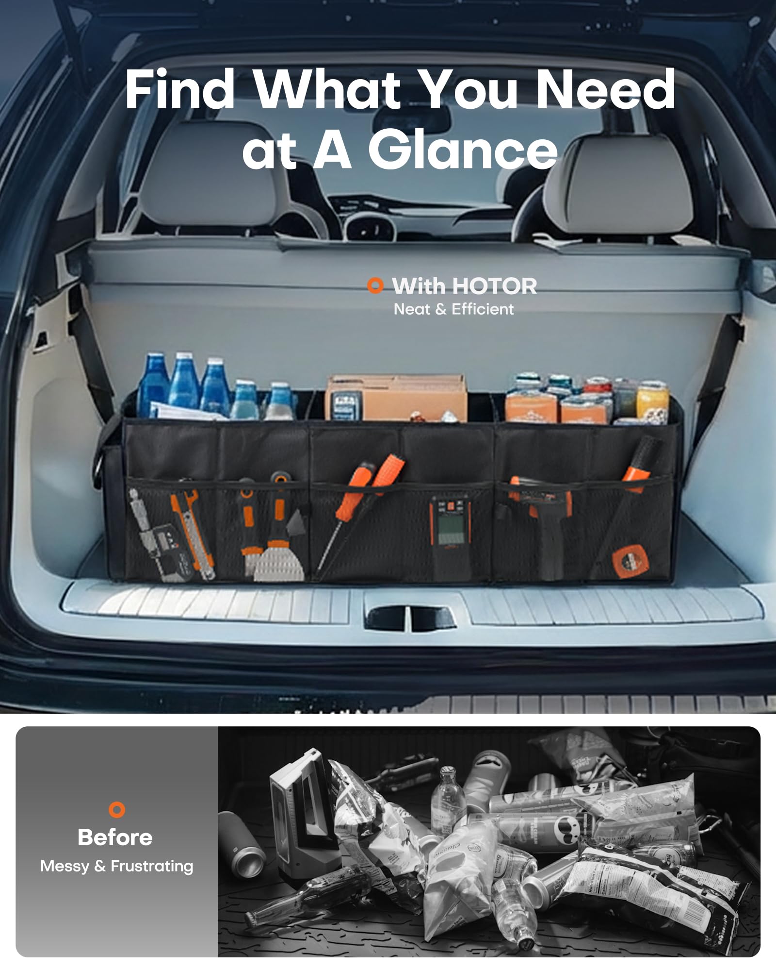 CONVENIENT ACCESS: HOTOR car trunk organizer for SUV is equipped with 2 compartments and 6 stretchy mesh pockets to make items easy to see and grab when needed. No more digging around a messy trunk to find what you need. Just grab and go.