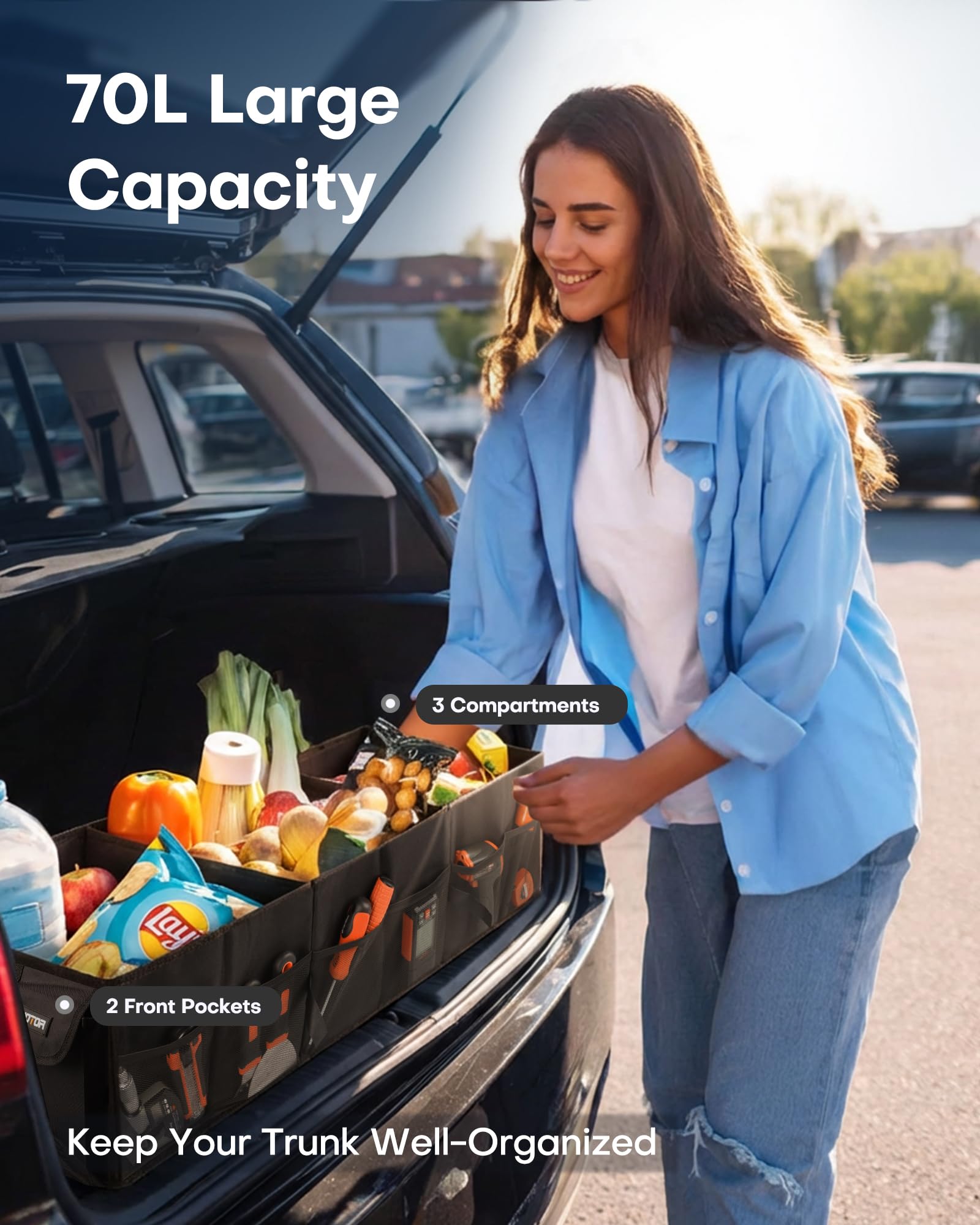 SPACIOUS STORAGE: With 3 large compartments and 6 extra mesh pockets, this car trunk organizer provides ample space to neatly store groceries, tools, sports equipment, and more. Keep your car trunk clutter-free and organized on every trip.