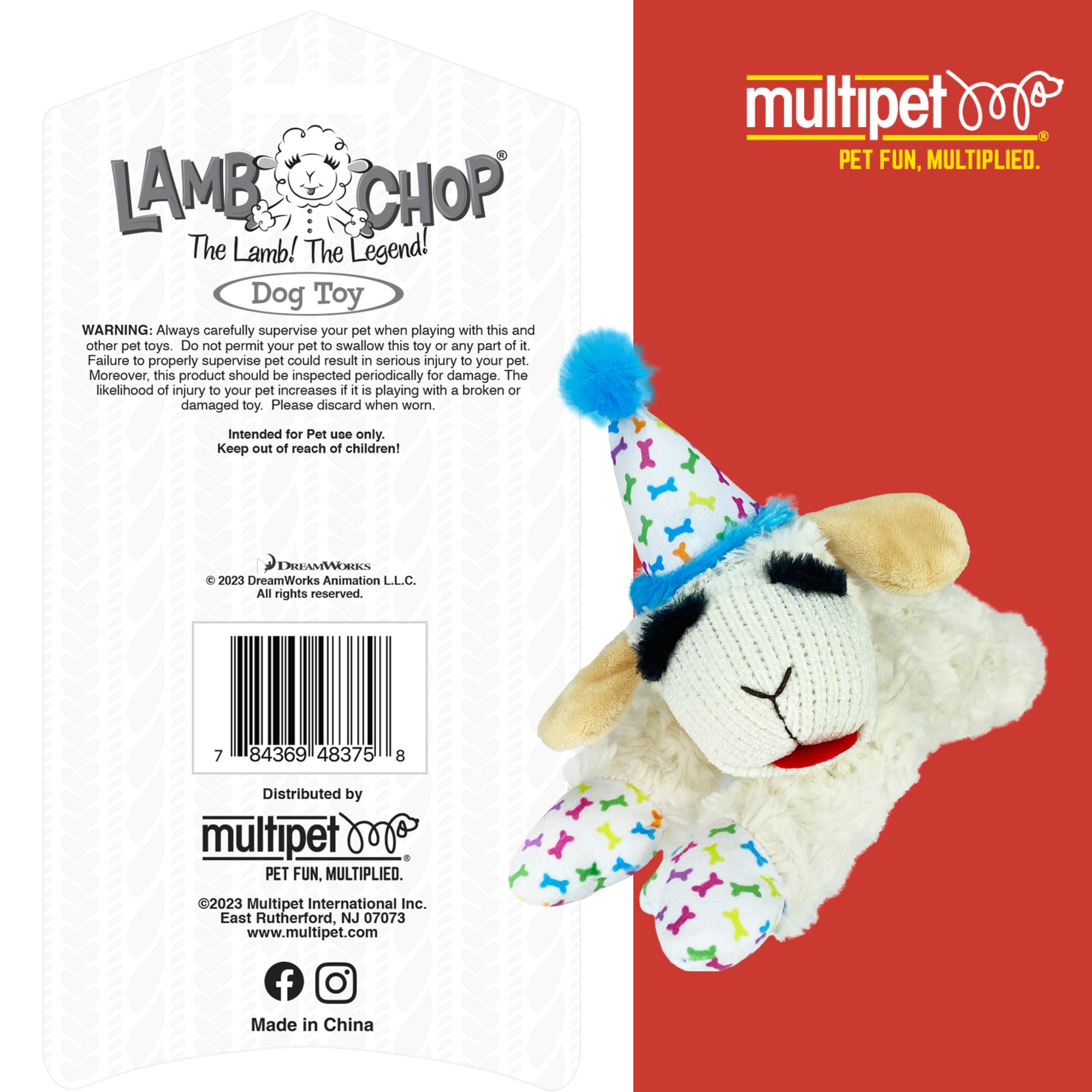 There’s no better way to say Happy Birthday to your dog than with a Lamb Chop dog toy! Lamb Chop with Birthday Hat from Multipet is the cute and cuddly dog toy your pet needs to celebrate their birthday this year. Shari Lewis’ iconic and beloved Lamb Chop is ready to play with your pet on their special day. This dog toy features Lamb Chop wearing a birthday hat with a multicolored, dog-bone print that is also on its hooves. Soft, snuggly, and oh so cute, the Lamb Chop with Birthday Hat dog toy is perfect for an afternoon of playing … or birthday partying! This dog toy measures 10.5” and is blue-trimmed on party hat. You will receive one item.