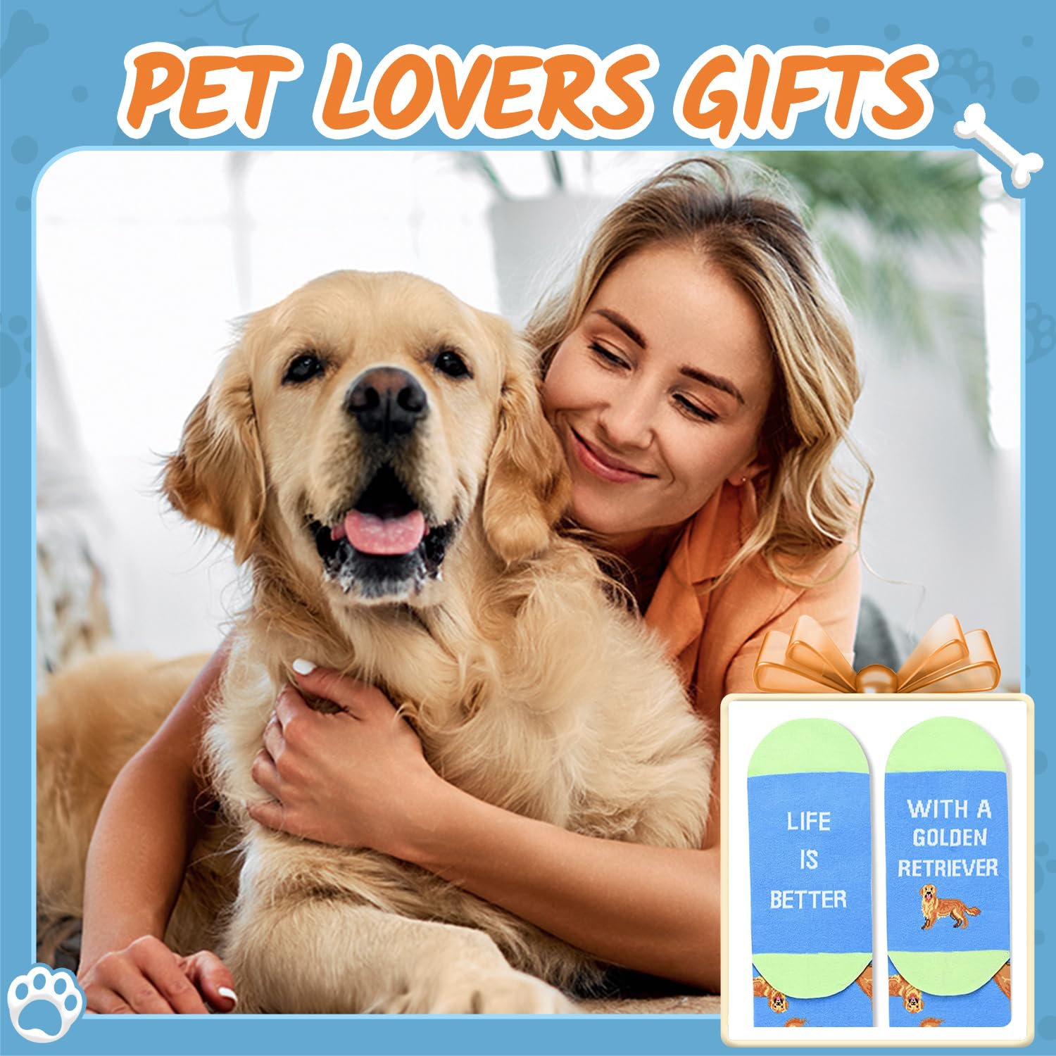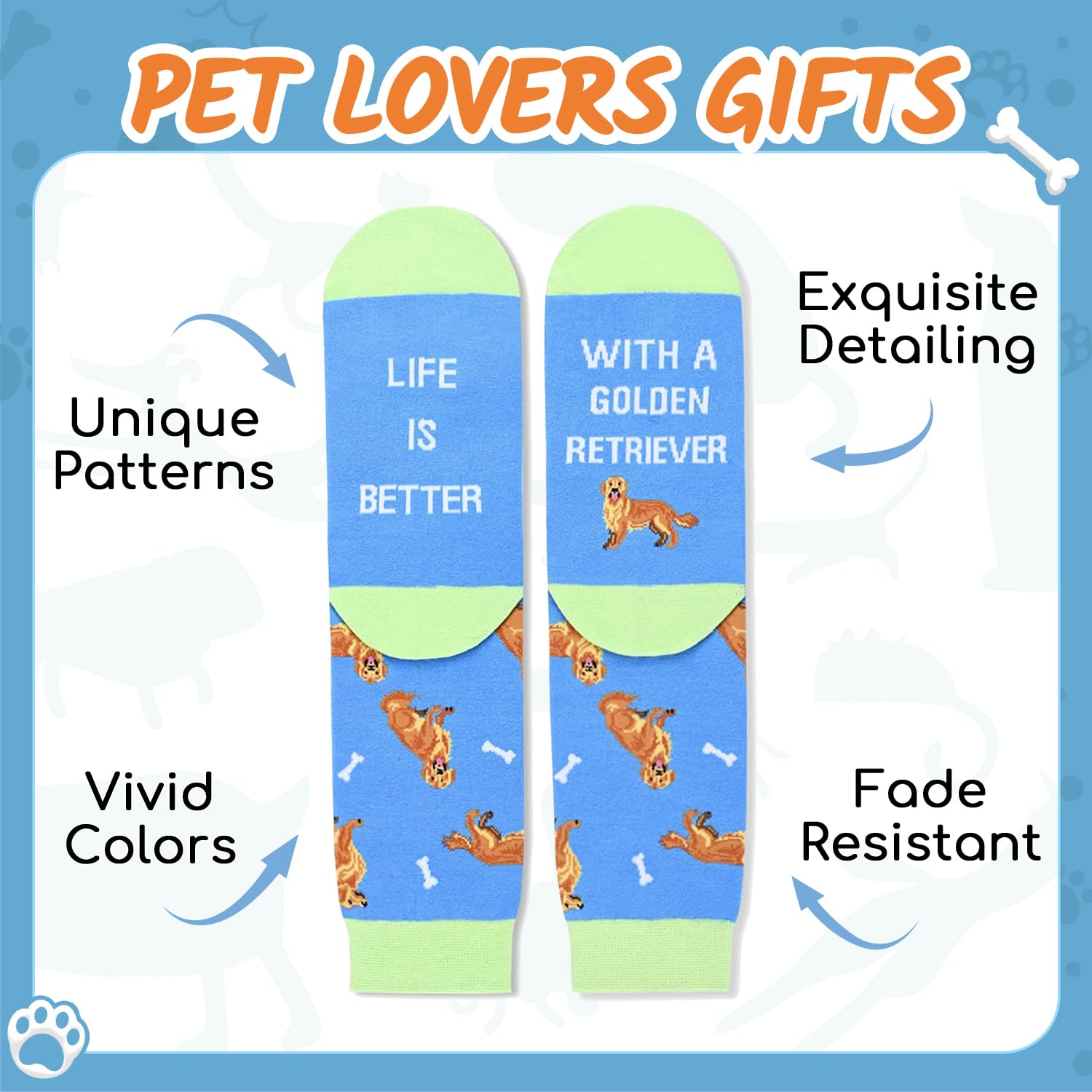 GOLDEN RETRIEVER LOVER SOCKS - Our funny socks are designed for both women and men and feature cute Golden Retrievers and bones in blue, with the funny sayings "LIFE IS BETTER WITH A GOLDEN RETRIEVER".