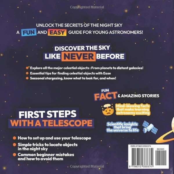 π Embark on an exciting journey through the stars! π Have you ever looked up at the night sky and wondered whatβs out there? With "110 Night Sky treasures to see with a telescope", young astronomers and curious beginners will unlock the mysteries of the cosmos in a fun and easy way! This beginner-friendly stargazing guide takes you step by step through the most amazing celestial sights, from dazzling planets and shining stars to majestic galaxies and mysterious nebulae. Whether you're using a telescope for the first time or simply want to explore the sky with your eyes, this book makes astronomy accessible and exciting for all ages. π What youβll discover inside: β First steps with a telescope β Easy-to-follow tips to set up, use, and navigate the night sky like a pro. β 110 Must-see celestial objects β Discover planets, constellations, galaxies, and more, explained in a simple and engaging way. β Seasonal sky guide β Organized by season so you always know what to look for, no matter the time of year. β Fun facts & space secrets β Fascinating stories, myths, and mind-blowing facts about each celestial wonder. β Beginner-friendly navigation tips β Learn how to easily find objects in the sky using simple techniques. π Perfect for kids, families, and beginner astronomers who want to explore the universe from their backyard! Whether you dream of seeing Saturnβs rings, identifying famous constellations, or spotting a distant galaxy, this book is your ultimate guide to stargazing. β¨ Get ready for an unforgettable adventure, one star at a time! ππ