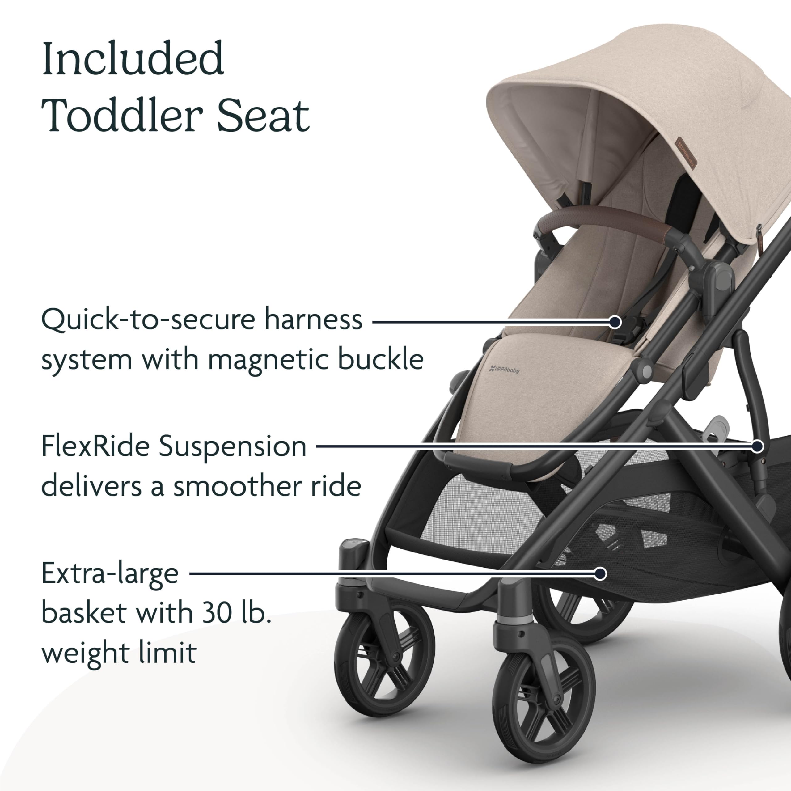 ALL-WHEEL SUSPENSION: Enhanced FlexRide Suspension, integrated directly into the frame of the Vista V3, ensures a smooth, controlled ride whether strolling with one child, using as a double stroller, or with three children in tow
