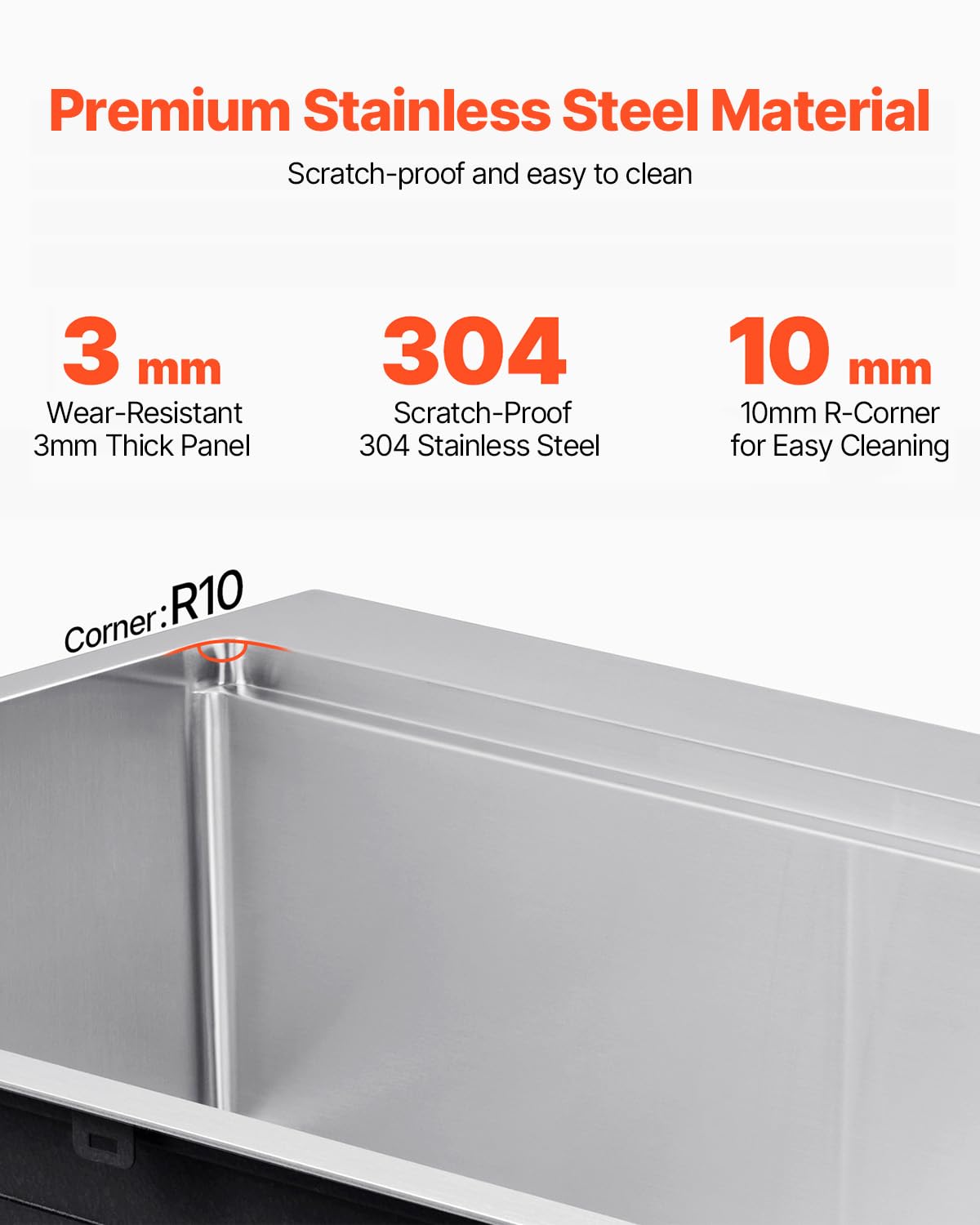 Premium Stainless Steel: Featuring rust-resistant brushed surface, this 304 stainless steel top-mount kitchen sink delivers exceptional durability, rust resistance, and easy maintenance. The reinforced 3mm-thick panel ensures long-lasting strength, while the R10° rounded corners provide a sleek, modern look and effortless cleaning.