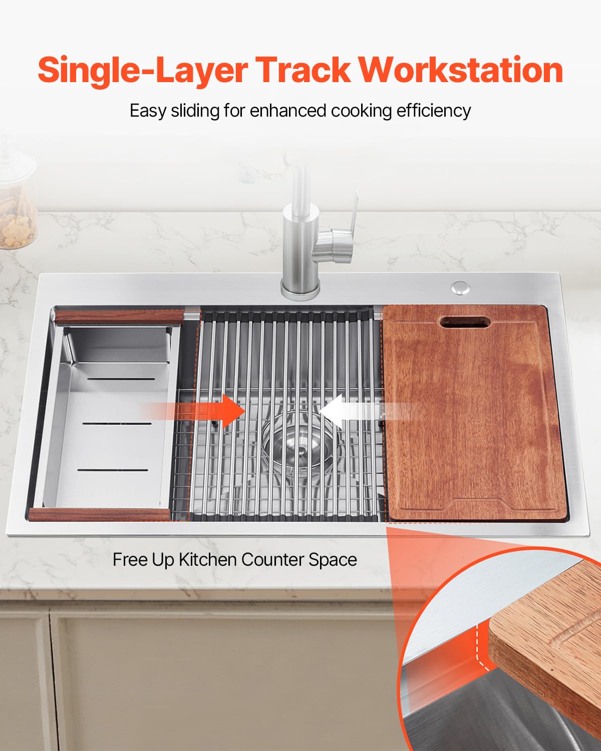 Workstation Kitchen Sink: This ledge sink features sliding track design that allows accessories to slide over the sink, simplifying meal prep without occupying kitchen counter space. Multiple accessories are provided to enhance cooking efficiency : 1 x Draining Rack (Rosewood Frame), 1 x Draining Curtain, 1 x Bottom Rinse Grid, 1 x Cutting Board (Rosewood).