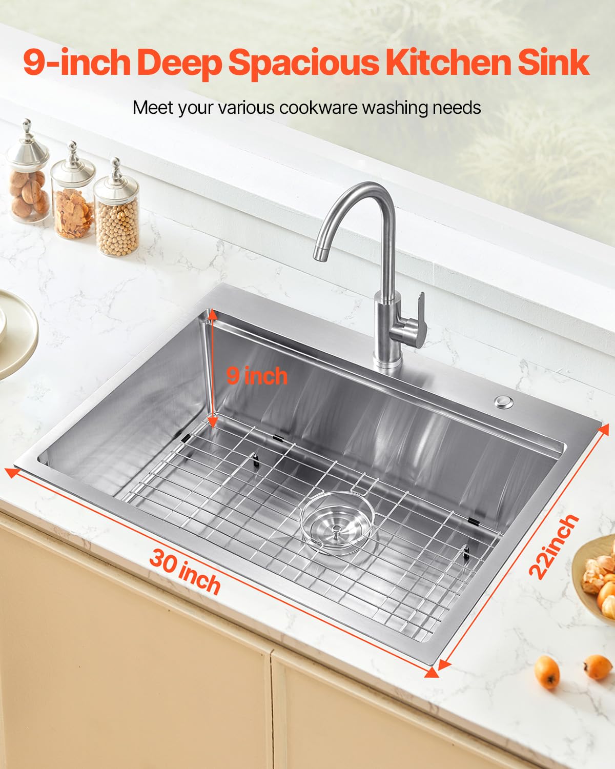 Spacious and Deep: With external dimensions of 30 x 22 inches and internal dimensions of 28 x 18 inches, this drop-in kitchen sink workstation offers a 9-inch deep bowl, providing ample space for washing various items such as cups, pots, and baking trays. Perfect for handling a variety of kitchen tasks with ease.