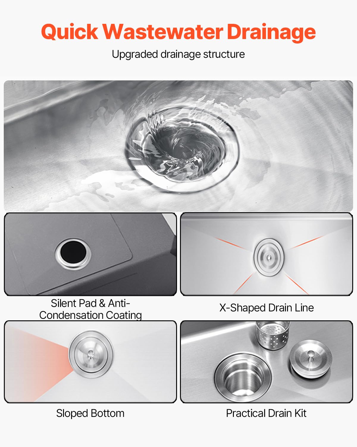 Optimized Drainage System: This bar kitchen sink workstation features an upgraded X-shaped drain line and a sloped bottom, ensuring fast water drainage while preventing water accumulation. And the included strainer basket effectively catches food debris, making drainage convenient and cleanup effortless.