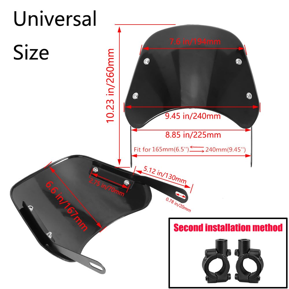 ★UNIVERSAL SIZE: This motorcycle windshield fits 5 to 7 inch round headlights. No matter what brand, as long as the size is the same, it will fit.Two mounting methods (with two e-bike mounting brackets)