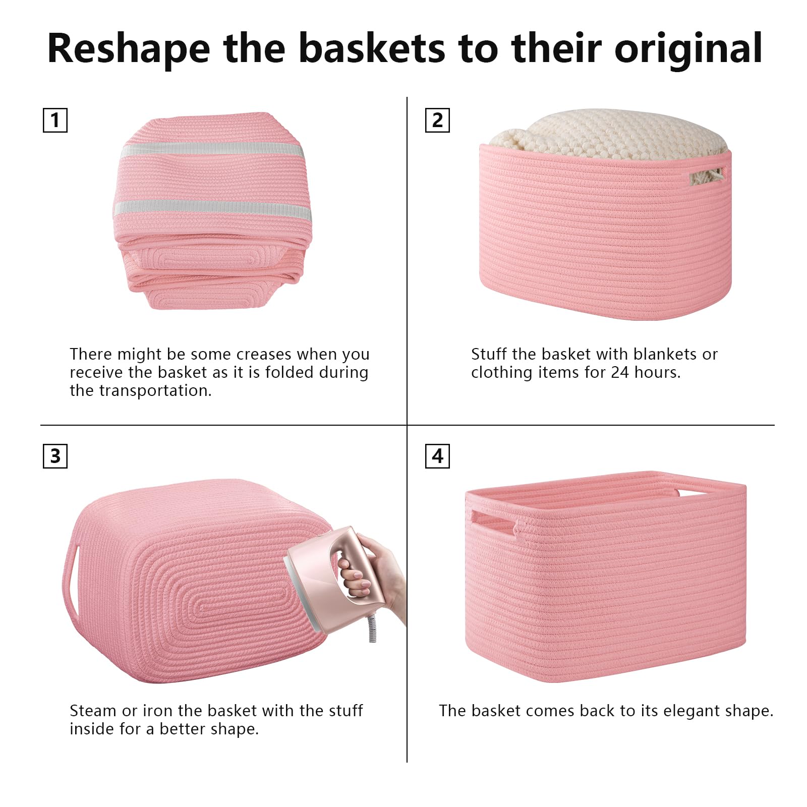 Washable: These cube storage bins can be washed by hand or machine with gentle detergent. NOTE: These cotton rope baskets are folded when shipping, but it will turn back to its elegant shape quickly if you fill it with some towels or clothing, and iron is great idea to remove the creases
