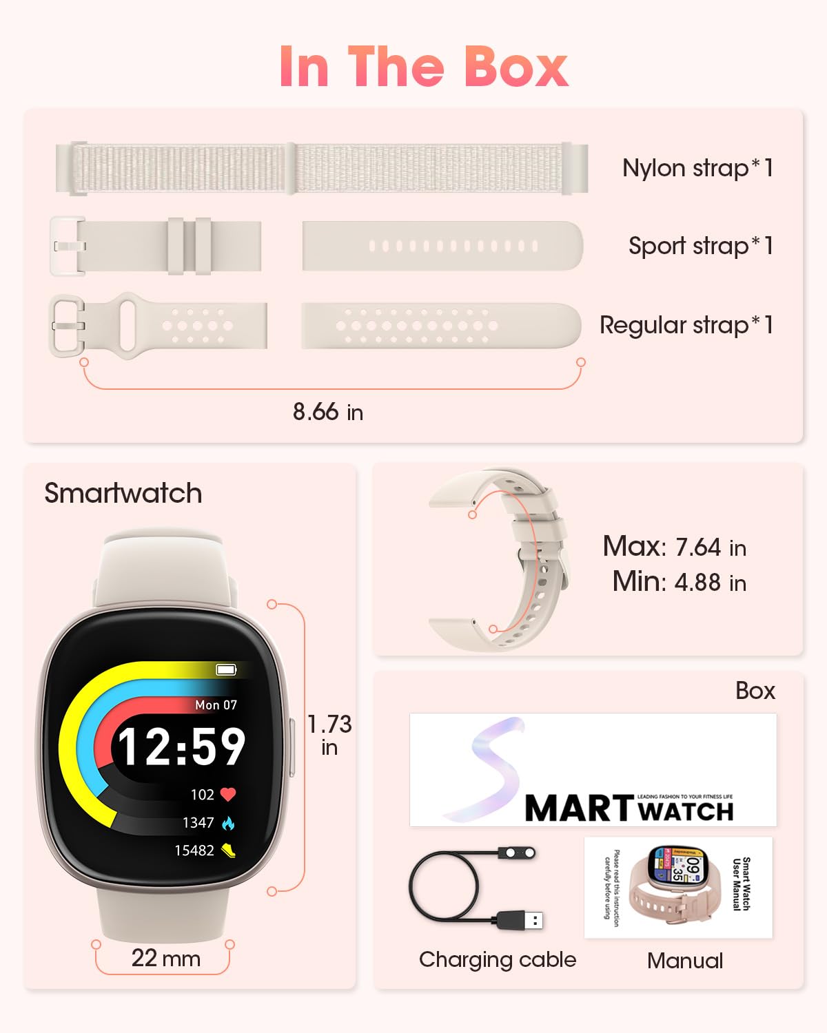 Introducing our latest smart watch, a blend of cutting-edge technology and elegant design that enhances your daily life. Perfectly suited as watches for men and watches for women, this device offers a range of features designed to cater to your every need. 1.83-inch Color Screen: Enjoy vibrant visuals with a large, clear display. 500+ Cloud Watch Faces: Choose from a wide selection or upload your own images to personalize your watch face. Heart Rate Monitor: Keep track of your heart rate throughout the day. Blood Oxygen Level Tracking: Monitor your oxygen saturation levels. Menstrual Cycle Tracking: Specially designed for women to record menstrual cycles. Activity Tracking: Measure your step count, calorie burn, and distance traveled with precision. 120+ Sports Modes: From running to swimming, track over 120 sports activities with accurate data logging. 5ATM Water Resistance: Ideal for all your water-based activities. Sleep Tracking: Analyze your sleep patterns, including deep sleep, light sleep, wake time, and REM cycles. Up to 10 Days: Enjoy extended battery life with 7-10 days on a single charge. Fast Charging: Full charge in just 2.5 hours. Bluetooth Calls: Make and receive calls directly from your watch, including SOS emergency dialing. Notification Alerts: Receive SMS and app notifications from Facebook, WhatsApp, Twitter, and more. Voice Assistant: Use voice commands for experience. Versatile Band Options Three Interchangeable Bands: Includes a sport band, silicone band, and nylon band to fit different occasions and preferences. Additional Functions Weather Forecast: Stay informed with real-time weather updates. Music and Camera Control: Manage your music and control your camera effortlessly. Stopwatch, Alarm, Phone Finder, Flashlight, Calculator, and Games. Our fitness tracker offers everything you need in activity trackers and smartwatches, combining the best of smart watches for men and smart watches for women.