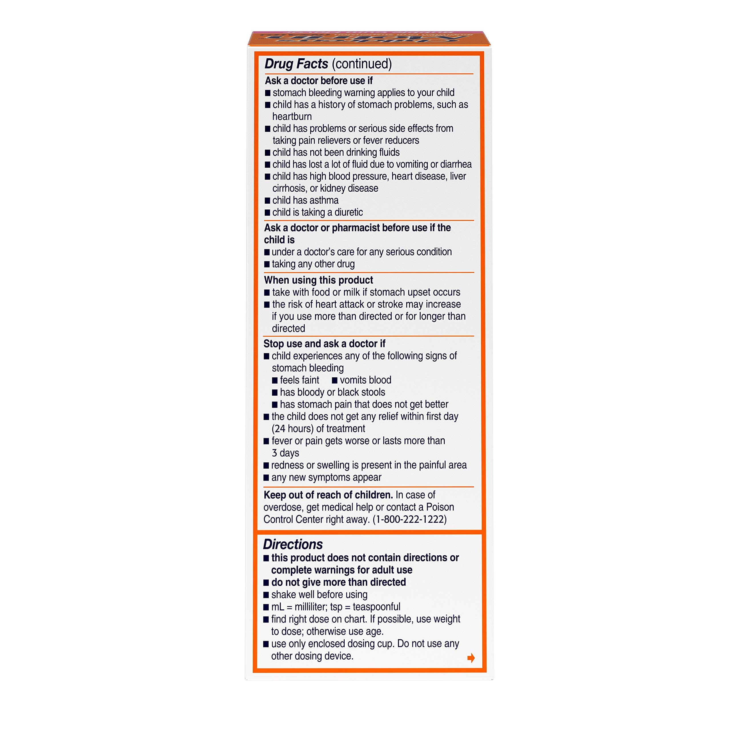 This oral suspension medicine for kids contains 100mg per 5mL of ibuprofen, a known NSAID pain-reliever and fever-reducer to provide relief pain due to the cold & flu