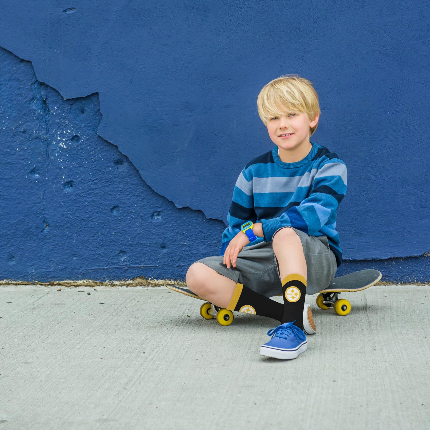 Comfortably Fits the Pittsburgh Steelers Fan Shoe size Youth 13, 1-5. These socks are a MUST HAVE on gameday for any Steelers fan.