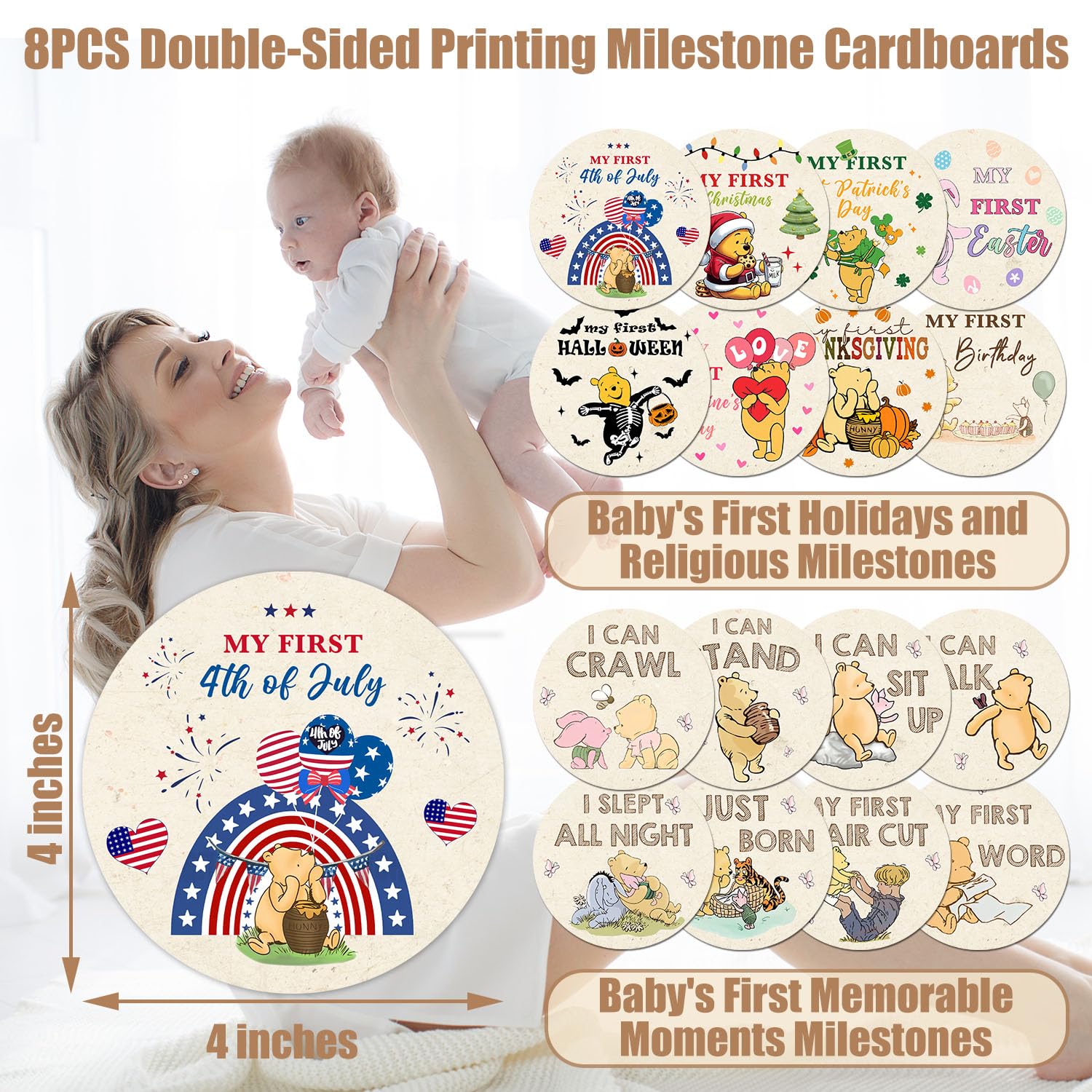 Package Contents: The package contains 1 Winnie baby milestone blanket, 2 felt photo frames and 8 double-sided printed cardstock (including 8 holidays + 8 baby's unforgettable moments), which can record every precious moment of your baby and leave warm and beautiful memories of his growth.
