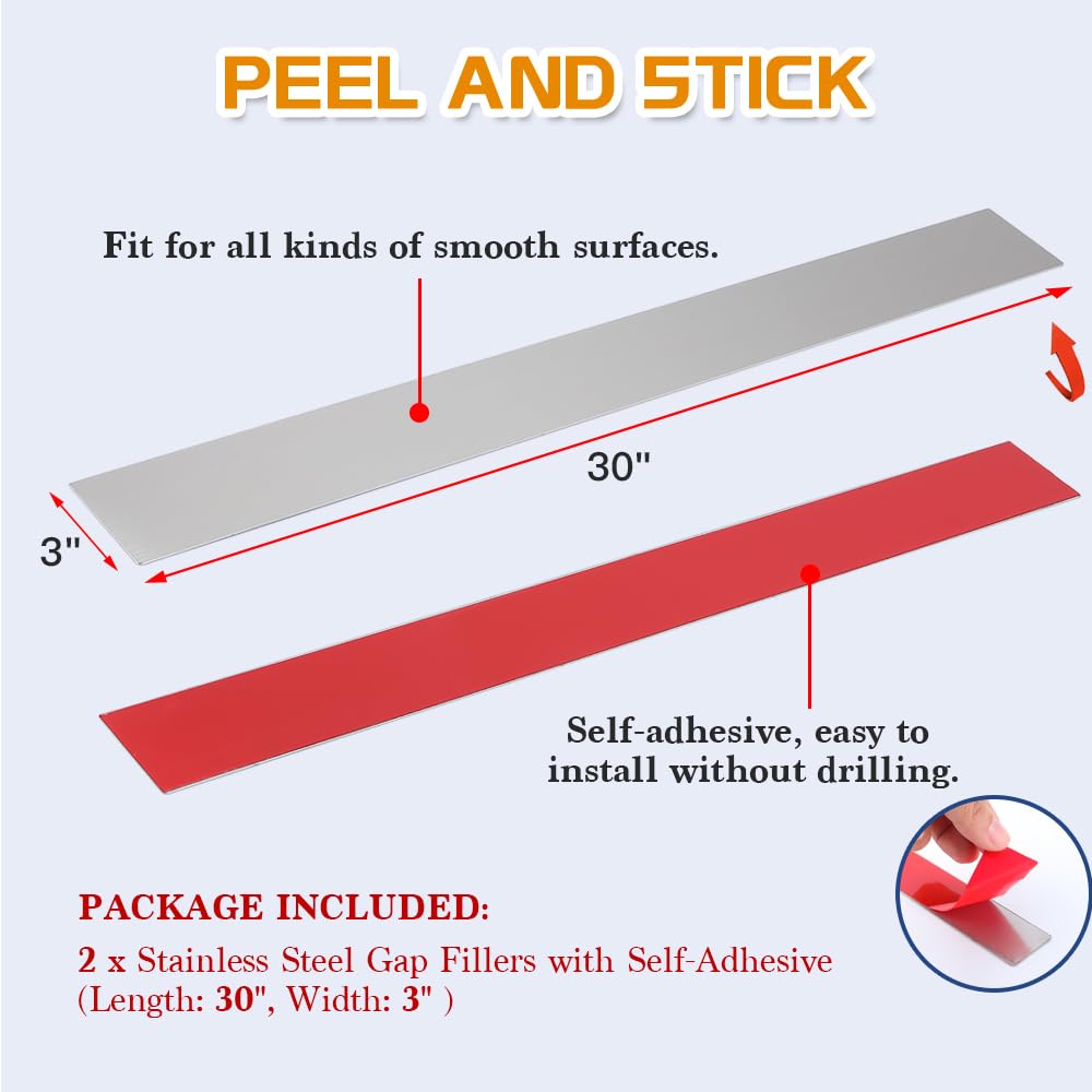 304 Brushed Stainless Steel Sheet Gap Filler, Metal Trim Strip, Self-Adhesive, 30" Long, 3'' Wide, 20Ga Thickness Annoyed about the unsightly gap between the new double wall oven/ microwave and cabinet? Have you been looking for gap cover to keeping food/grease/liquids from running down the back of the stove/range for a long time? Now the 304 Brushed Stainless Steel Sheet Gap Filler can help you say goodbye to the the gap, which was created by replacing new appliances to your kitchen. Whether wall oven/ microwave combo, or vent hood, refrigerator, cooktop, our stainless trim strip can always match your high end stainless steel appliances perfectly. Features of This Gap Cover: 1. 30" long design fits for most top brand stove/ range / oven/ microwave, and can be easily cut to the desired size. 2. This stainless trim strip is self-adhesive, easy to install just in 10 seconds without drilling. 3. Fit for all kinds of smooth surfaces, high viscosity and long lasting. No residue when removing. 4. Made of premium brushed finish 304 stainless steel, high resistance to heat, corrosion and scratch. 5. Smooth surface after anti fingerprint treatment, with delicate feel, not easy to stick fingerprints and dust. 6. Laser cut and deburr edges for safe handling and easy cleaning. Specifications: ►Material: 304 Brushed Stainless Steel ►Color: Fingerprint-Resistant Silver Stainless Steel ►Thickness: 0.04 inch (20 ga.) ►Width: 3 inch ►Length: 30 inches ►Package included: 2 PCS Warm Tips: Before buying, please measure the width and length of the gap. Making sure whether this Stainless Steel Sheet Gap Filler fits the gap between oven/stove edge and cabinet