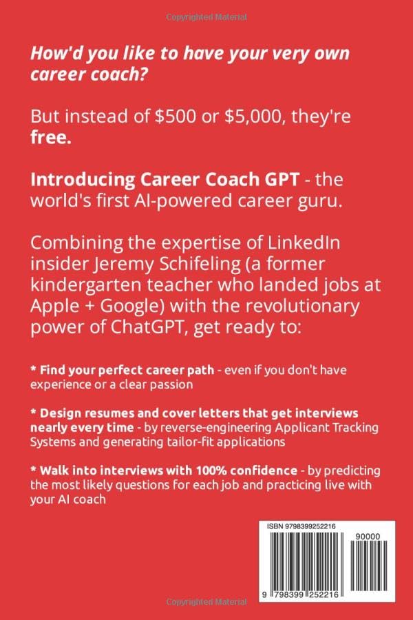 How'd you like to have your very own career coach? But instead of $500 or $5,000, they're free. And they just happen to know more about every industry and job than any other coach in the world. Introducing Career Coach GPT - the world's first AI-powered career guru. Combining the expertise of LinkedIn insider Jeremy Schifeling (a former kindergarten teacher who landed jobs at Apple + Google) with the revolutionary power of ChatGPT, get ready to: Find your perfect career path - even if you don't have experience or a clear passion Turn your LinkedIn profile into a recruiter magnet - by using your AI algorithm to conquer LinkedIn's algorithm Design resumes and cover letters that get interviews nearly every time - by reverse-engineering Applicant Tracking Systems and generating tailor-fit applications Walk into interviews with 100% confidence - by predicting the most likely questions for each job and practicing live with your AI coach So if you're ready to go beyond generic advice from career blogs and get the bespoke guidance that only a private coach can provide, get ready for Career Coach GPT. And get ready to build a career - and a life - you love!