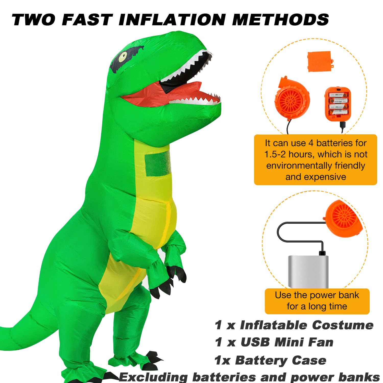 Inflatable dinosaur suit package include:1x trex clothes,1x inflatable air pump,1x battery box(Not include battery). This inflatable dinosaur costume for adults comes in one size (65 "to 78" in)