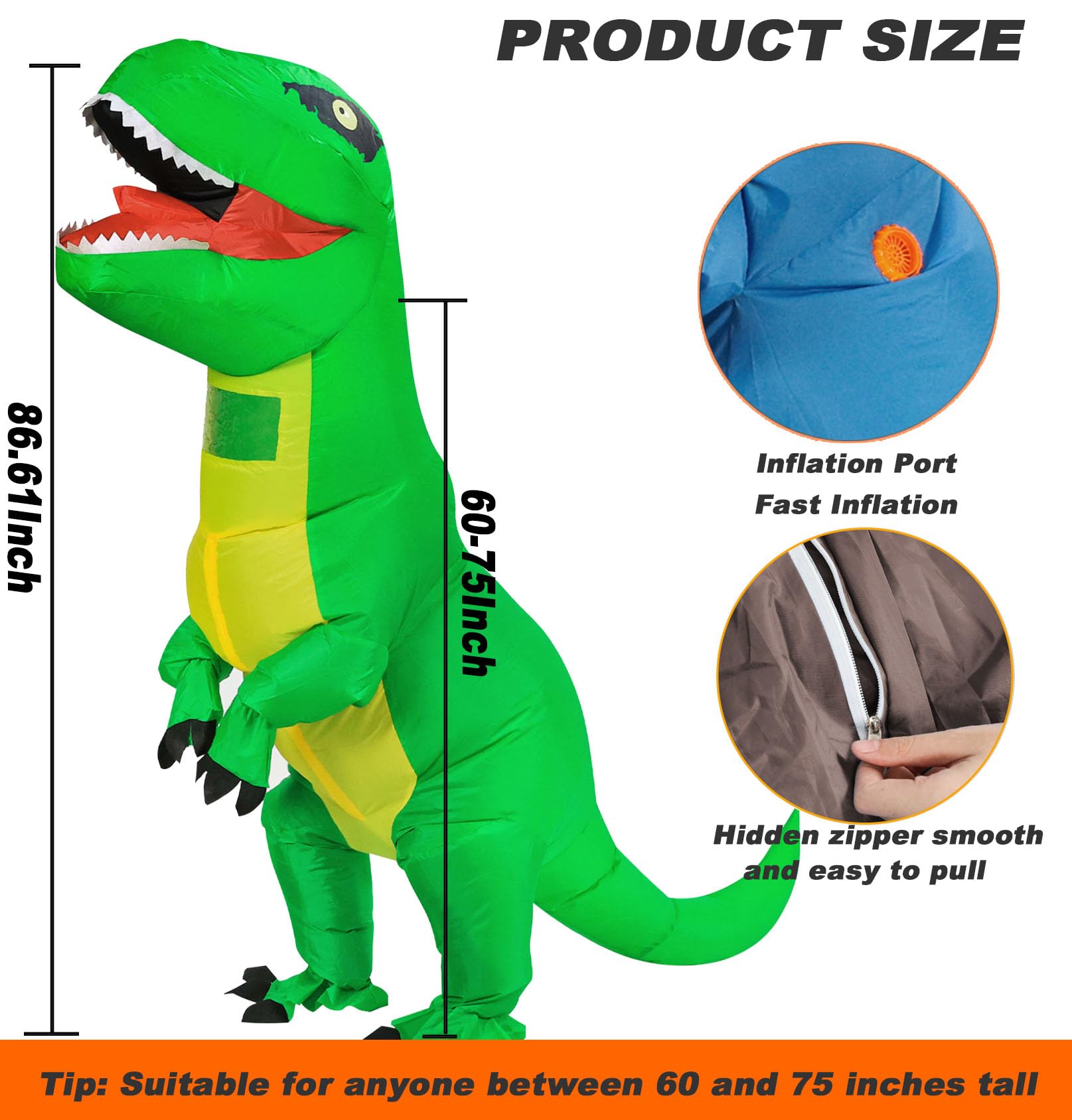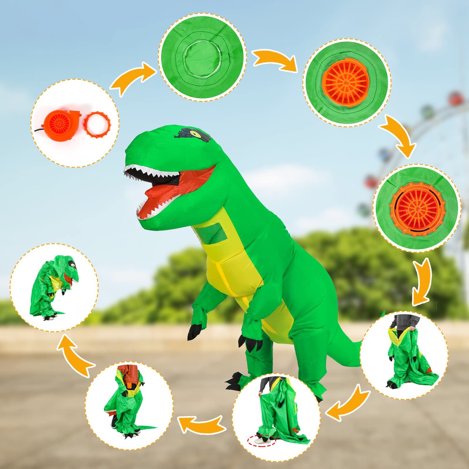 Easy to Use: The dinosaur inflatable costume has a built-in fan, which can quickly inflate in a few seconds. The inflatable costume has a zipper design, which is easy to put on and take off. The inflatable costume has a drawstring design, which can adjust the size of the inflatable costume according to your needs.