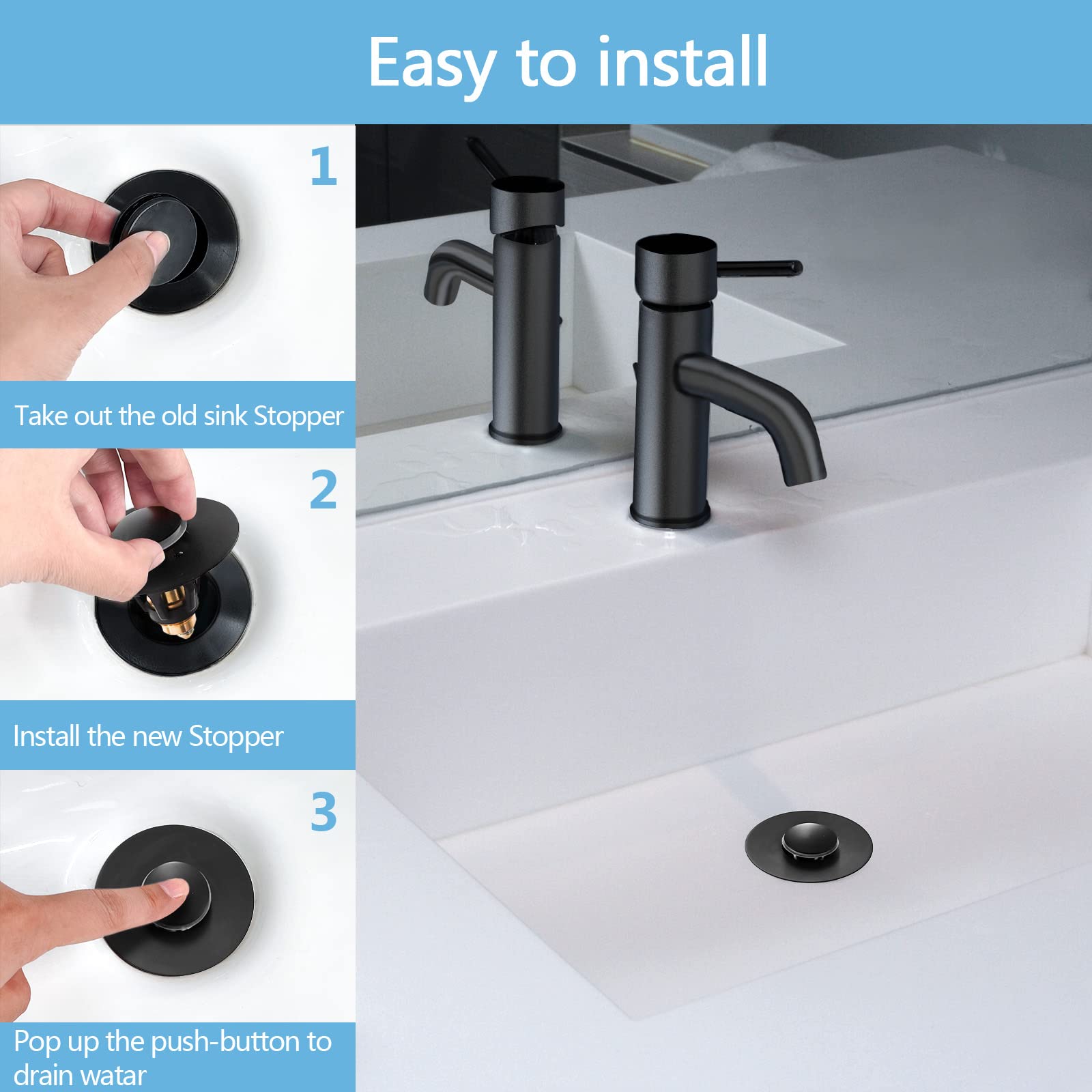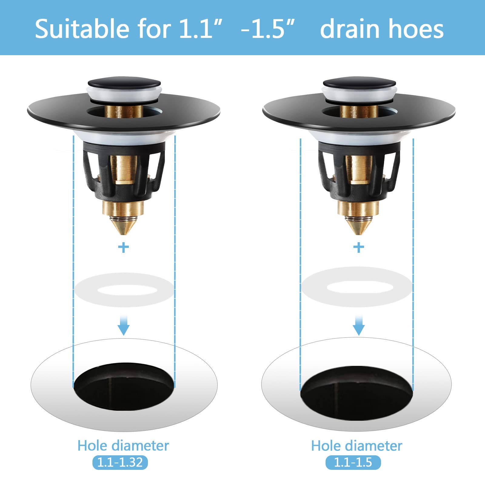 【PERFECT COMPATIBILITY】Black pop up drain stopper for bathroom sink is designed with a new small diameter (1.1~1.5 inch inner diameter), our 2 silicone rings ensure a perfect fit with various drain holes, conforming to most US standards 1 1 /8" ~1 1/2" sink drain holes (depth: about 1.5")Other similar products are too large for American sinks.