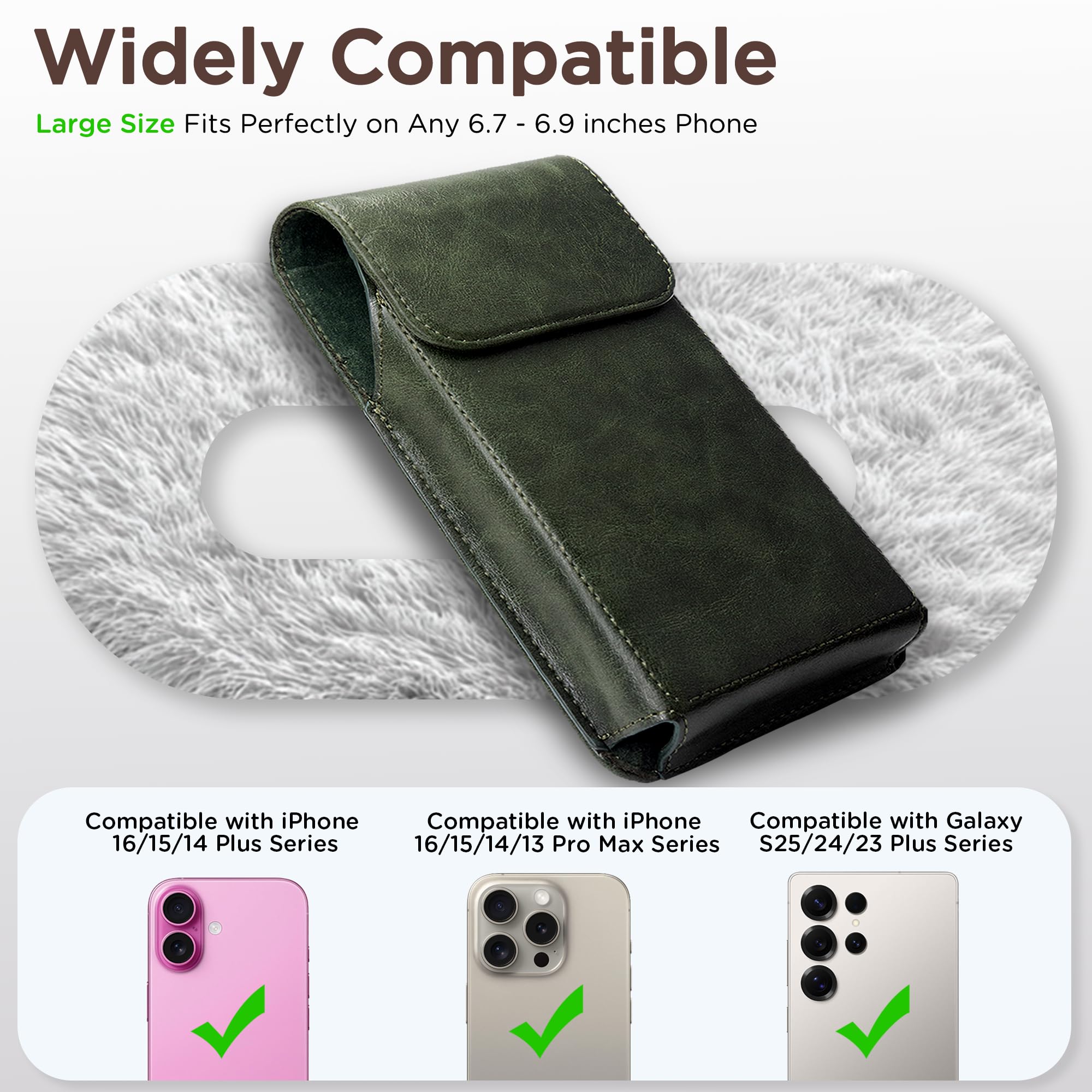 Wide Compatibility: This leather phone pouch with belt clip is widely compatible with iPhone 17 Pro Max, iPhone 16 Pro Max, iPhone Air, iPhone 16 Plus, iPhone 15 Pro Max, iPhone 15 Plus, iPhone 14 Pro Max, iPhone 13 Pro Max, iPhone 12 Pro Max, iPhone 11 Max, Samsung Galaxy S25+, Galaxy S24+