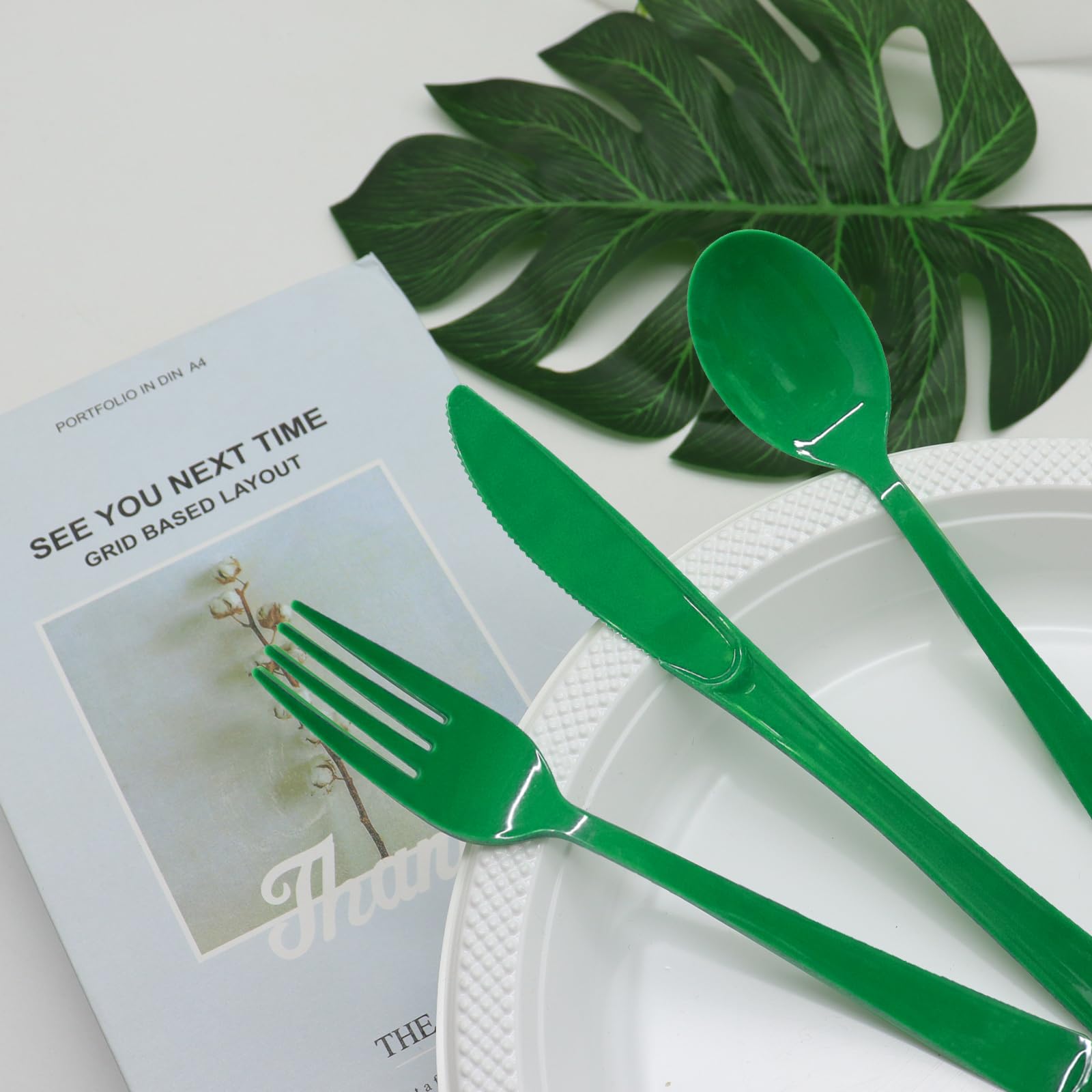 【Plastic Silverware Serve 50 】: This green plastic silverware includes 50 green plastic forks, 50 green spoons and 50 green knives, total 150 heavy duty plastic silverware.This pretty plastic silverware heavy duty will help brighten up your St.Patrick's Day, Christmas, wedding, birthday, shower or whatever your celebrated event is. The greater news is, it is disposable for fast cleanup during the event and afterwards.