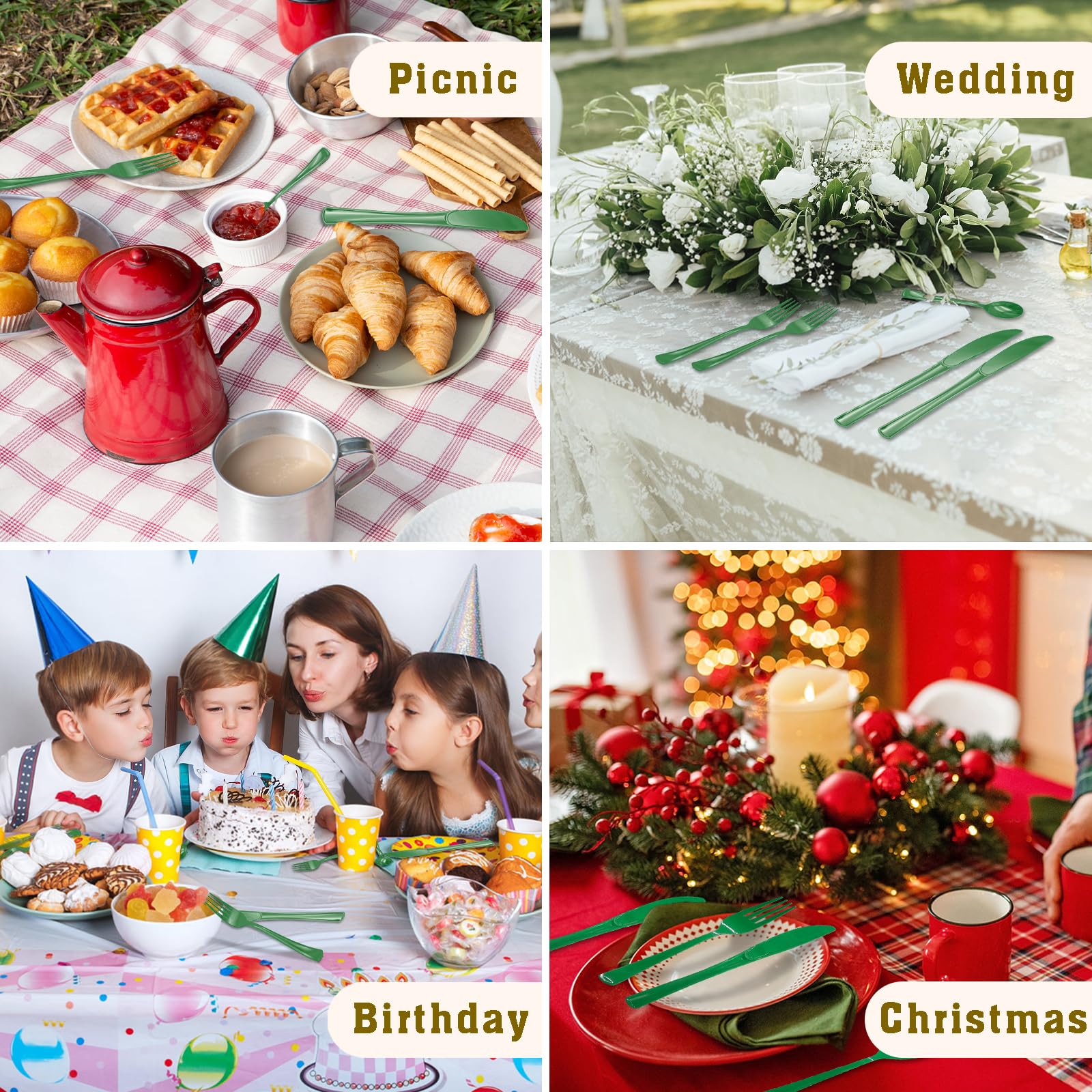 【Convenient and Reusable】The green plastic silverware is disposable and can easily be thrown away after the party, eliminating the hassle of a long wash and clean-up so you can focus on having a great time with friends and family. Of course, if you want to continue using the green plastic silverware, simply wash it in soapy water to restore its lustre and get it ready for your next party.