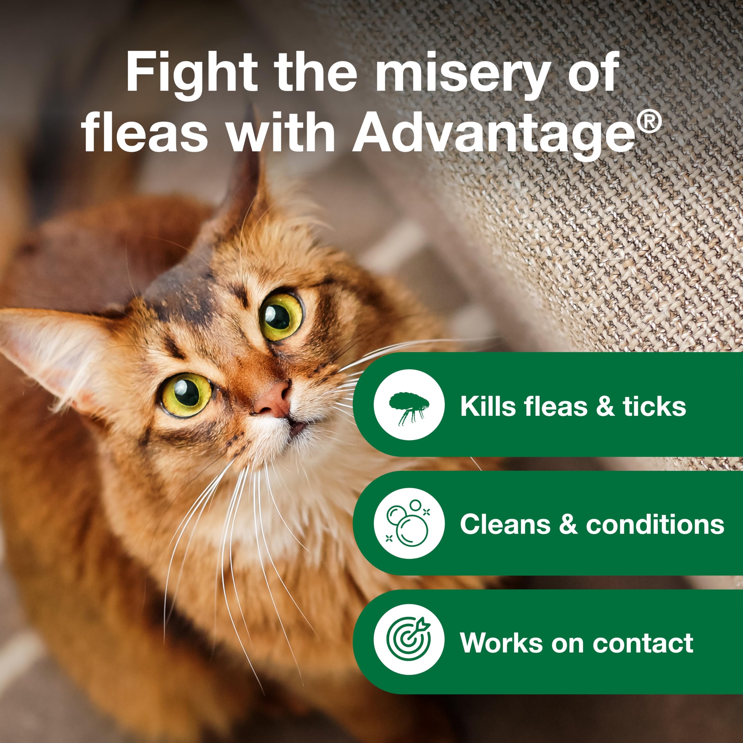 Advantage Treatment Shampoo for Cats & Kittens is a cat shampoo that kills fleas and ticks on contact. No prescription is needed to help prevent fleas that may cause redness, irritation and itching commonly associated with flea bite dermatitis. Simply use this specially formulated flea and tick cat shampoo up to once every 7 days to kill fleas and ticks and clean and condition your cat's coat. This cat and kitten flea treatment shampoo is easy to use. Simply wet your cat's coat for 2-3 minutes with warm water. Begin by applying the shampoo on your cat's head and ears and lather, making sure to wash carefully to keep shampoo out of eyes. Repeat on the neck, chest, middle and hindquarters, finishing legs last and paying attention to footpads and underbody. Be sure to thoroughly lather at the base of the tail, a spot commonly frequented by fleas. Allow the shampoo to sit for 5 minutes before rinsing thoroughly with water. The Advantage product family helps you fight fleas comprehensively - killing fleas on your pet, in your home and in your yard. To get the most out of Advantage Flea & Tick Treatment Shampoo for Cats & Kittens, it's best to use it as part of a complete flea treatment program powered by Advantage. Treat your dogs and cats with topical flea treatments, shampoos or sprays, your home and furniture with spot treatment flea spray or foggers and your yard with Advantage Yard & Premise Spray. Stock up and save on future orders of cat flea and tick shampoos with a subscription, and gain peace of mind that you'll always be prepared to kill fleas and ticks in your cat's next bath. Advantage is a trademark of Elanco or its affiliates.