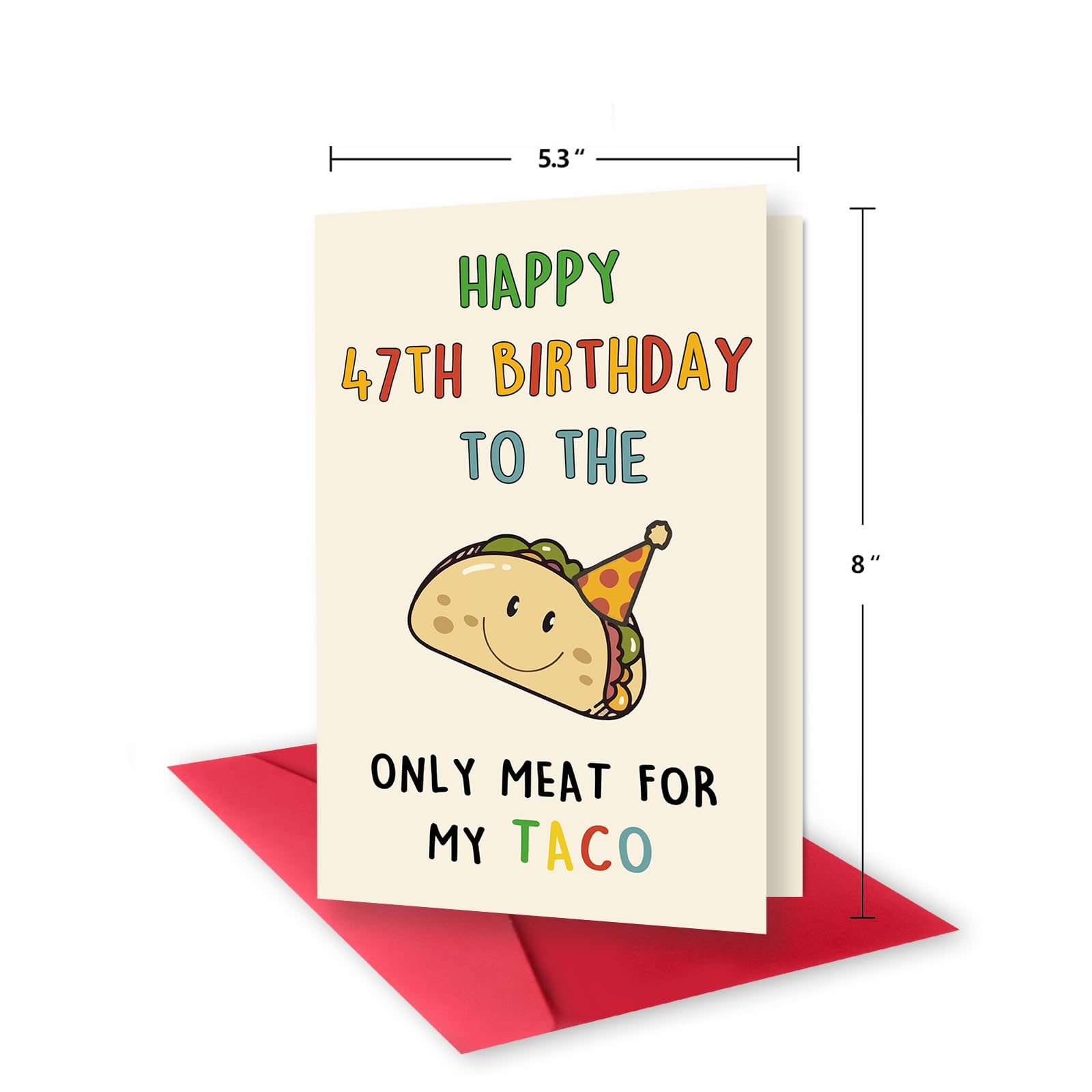 Funny Birthday Card for Him: Taco birthday card the cover reads "Happy 47th birthday to the only meat on my taco," making it an ideal gift for those who want to give him a fun birthday card.