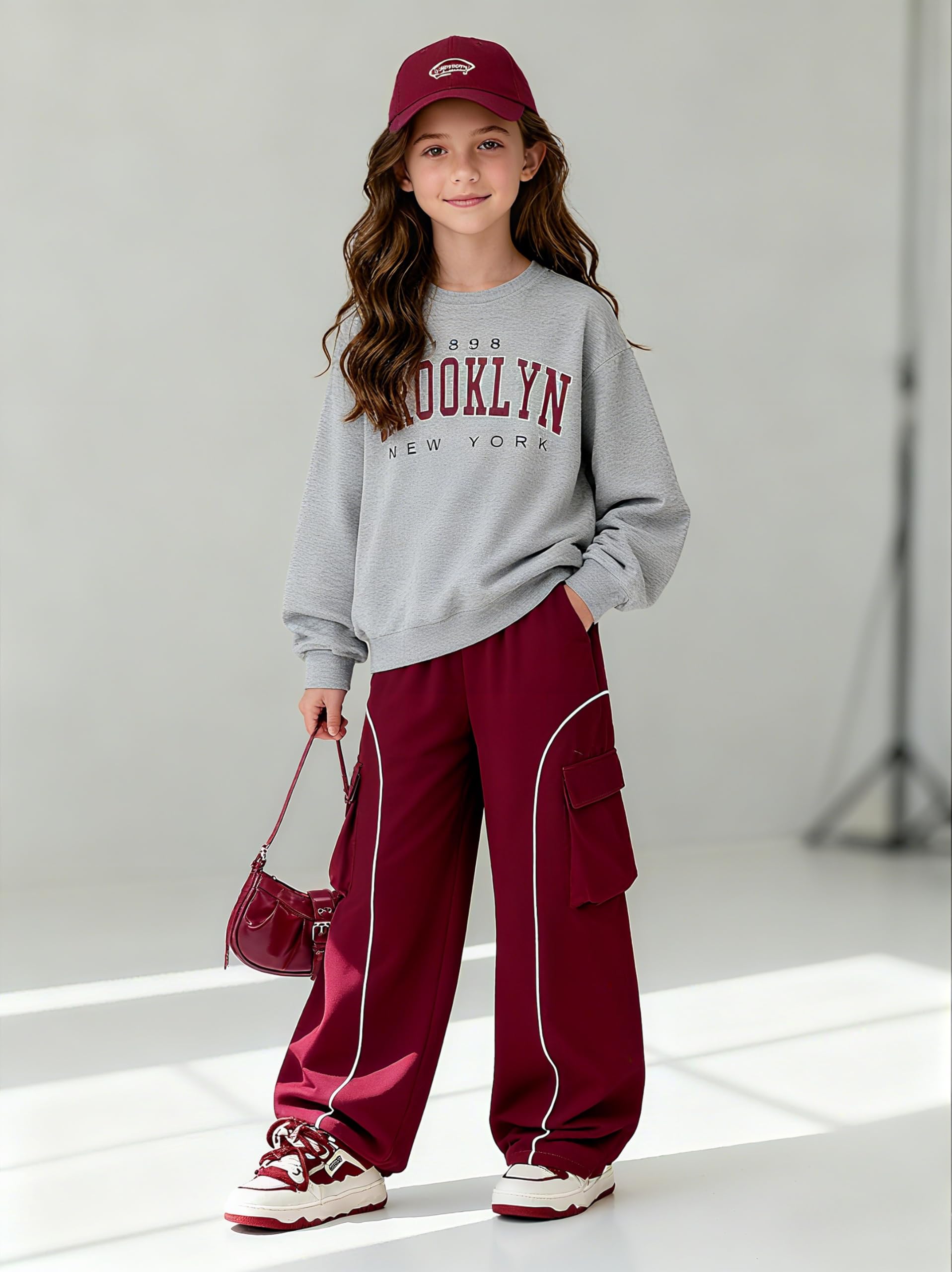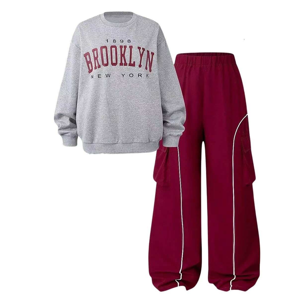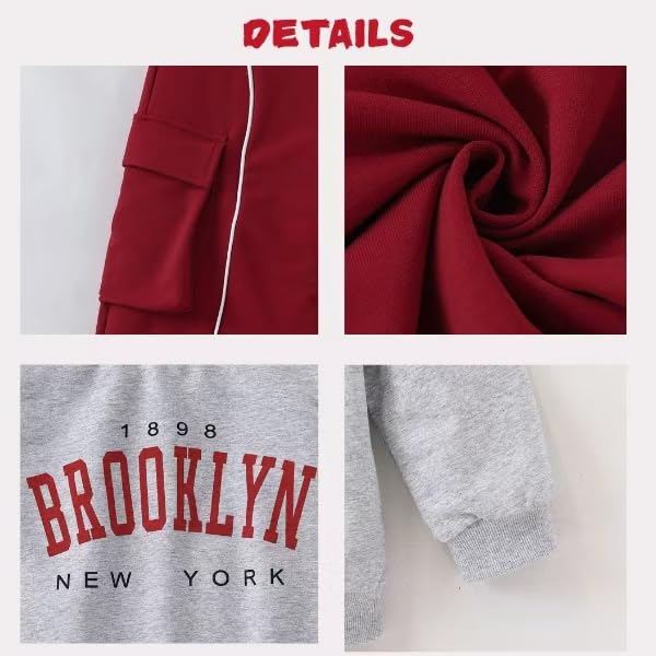 Style & Design: This 2-piece outfit consists of a gray crew - neck sweatshirt and a burgundy cargo pant. The sweatshirt is adorned with a “BROOKLYN NEW YORK 1898” graphic print, giving it a trendy and youthful look. The cargo pant comes with multiple functional pockets and white contrast piping, combining sportiness and practicality.