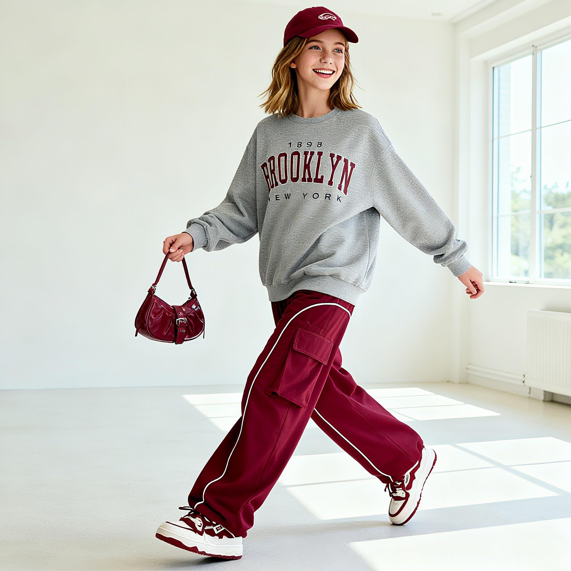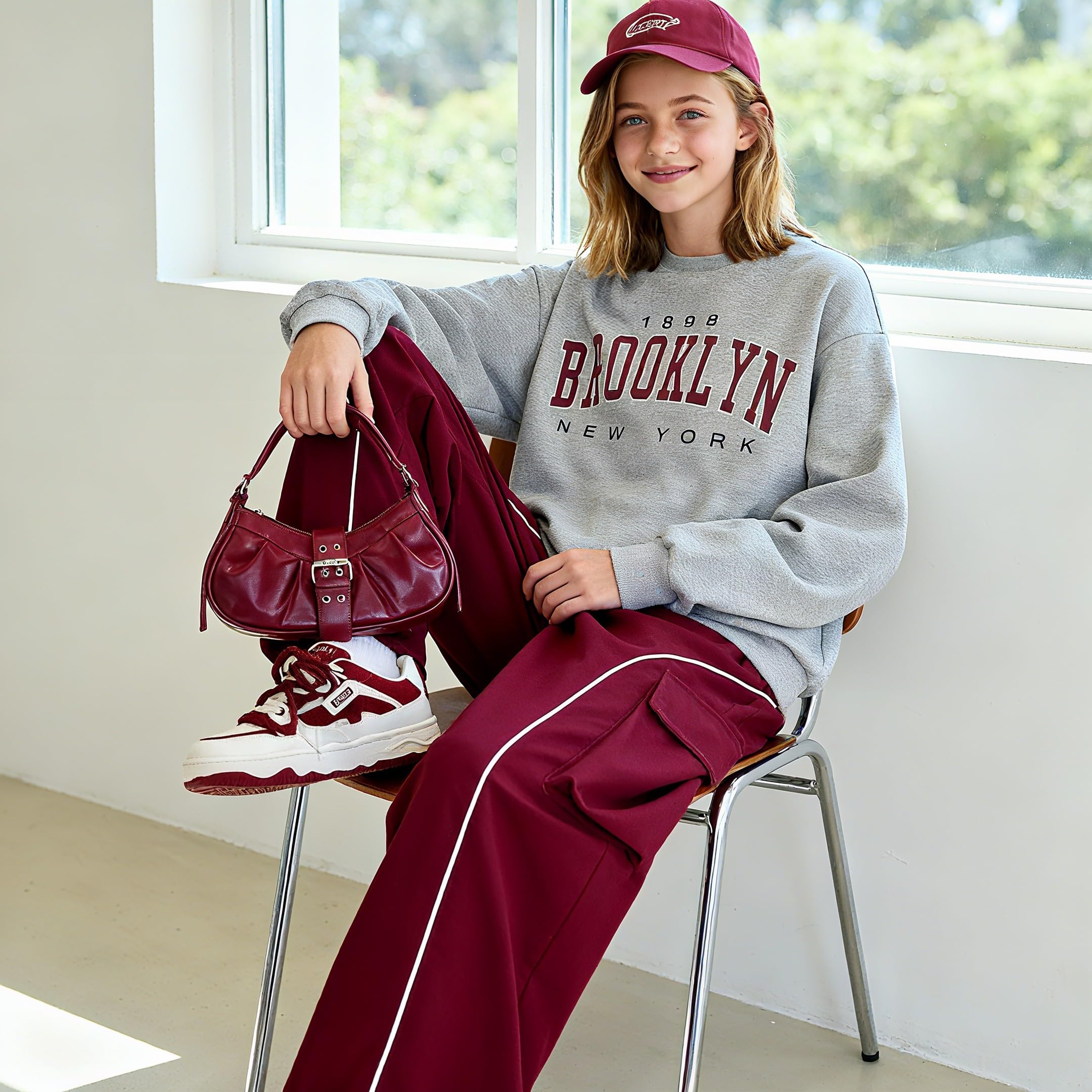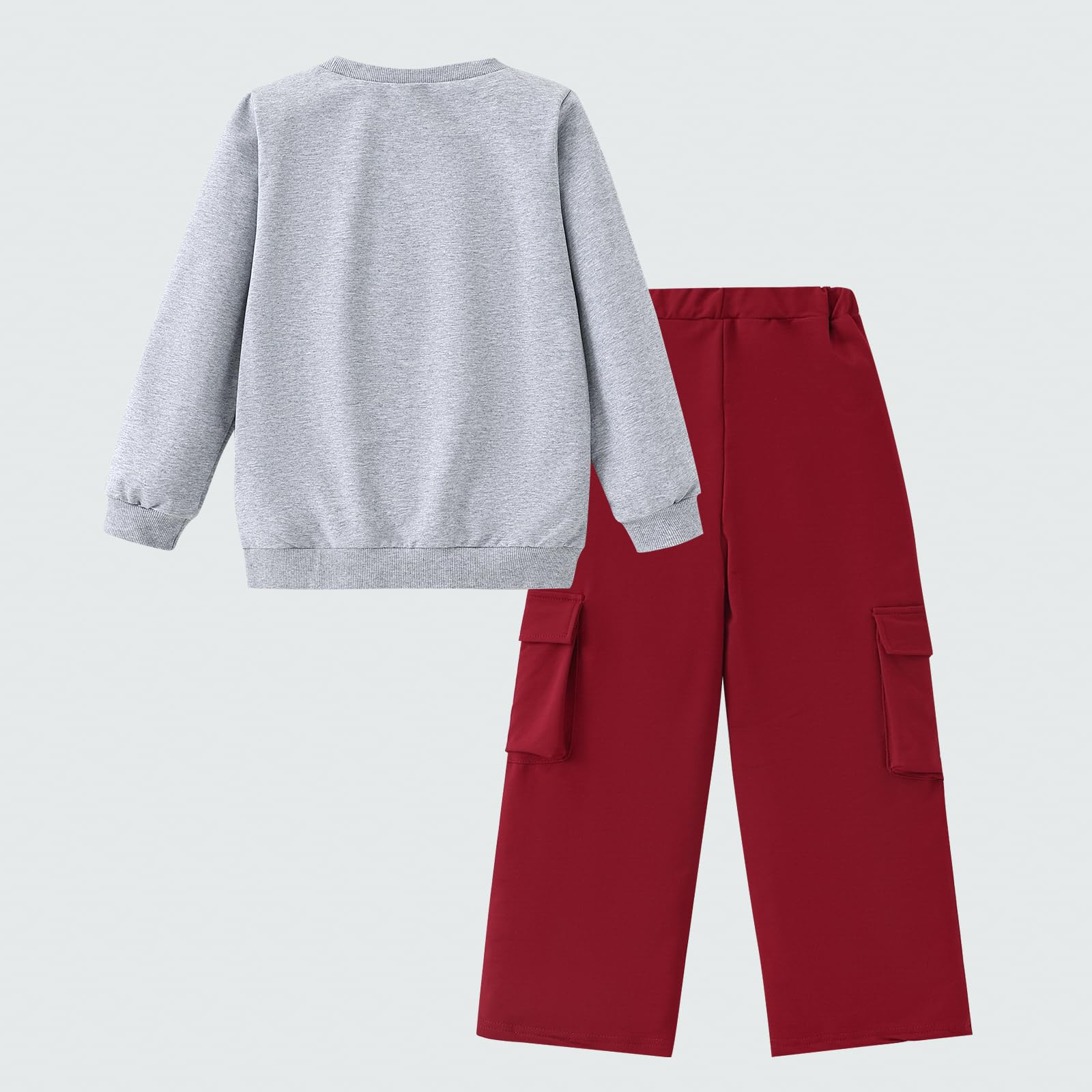 Style & Design: This 2-piece outfit consists of a gray crew - neck sweatshirt and a burgundy cargo pant. The sweatshirt is adorned with a “BROOKLYN NEW YORK 1898” graphic print, giving it a trendy and youthful look. The cargo pant comes with multiple functional pockets and white contrast piping, combining sportiness and practicality.