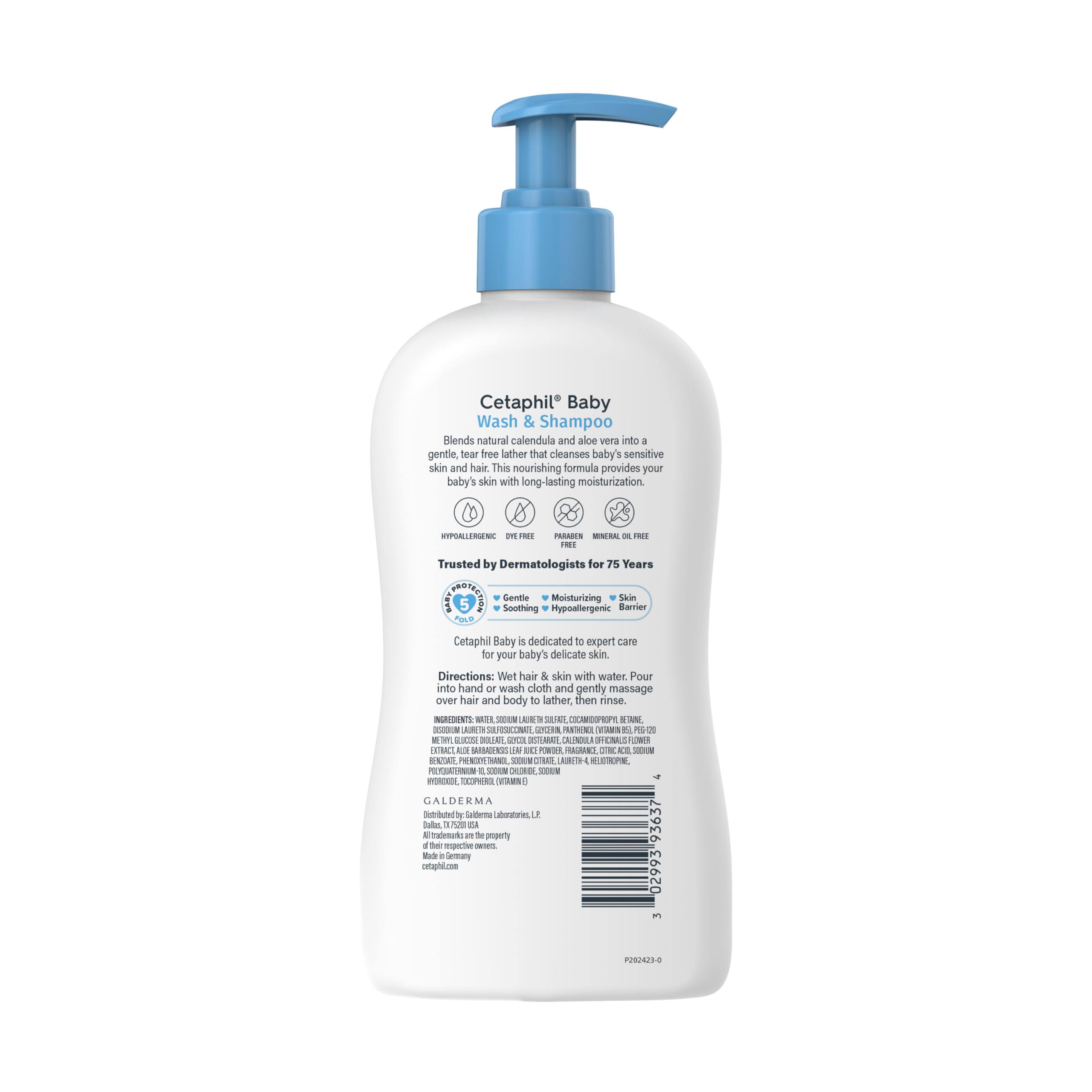 From the gentle skincare experts comes CETAPHIL Baby Wash & Shampoo, specially formulated to cleanse baby delicate skin and hair without drying and tested by dermatologists to be gentle on sensitive skin. It is made with a blend of soothing calendula extract derived from the marigold flower, vitamins E & B5 and aloe vera to keep baby soft, smooth and hydrated. As with all CETAPHIL Baby products, CETAPHIL Baby Wash & Shampoo contains NO parabens, colorants or mineral oil. It is hypoallergenic, gentle and safe for everyday use.