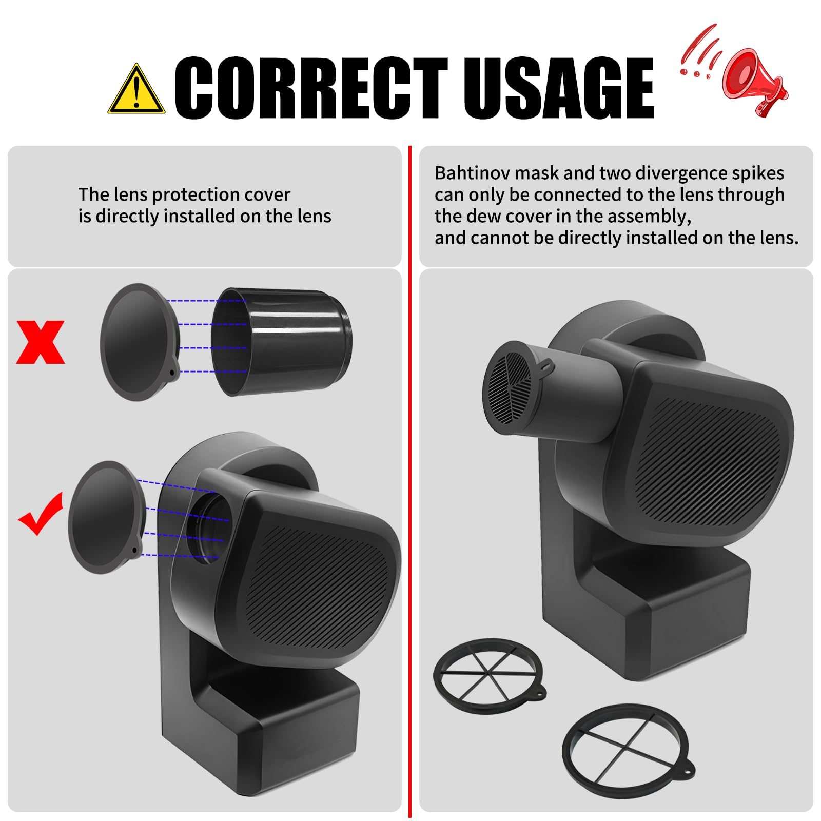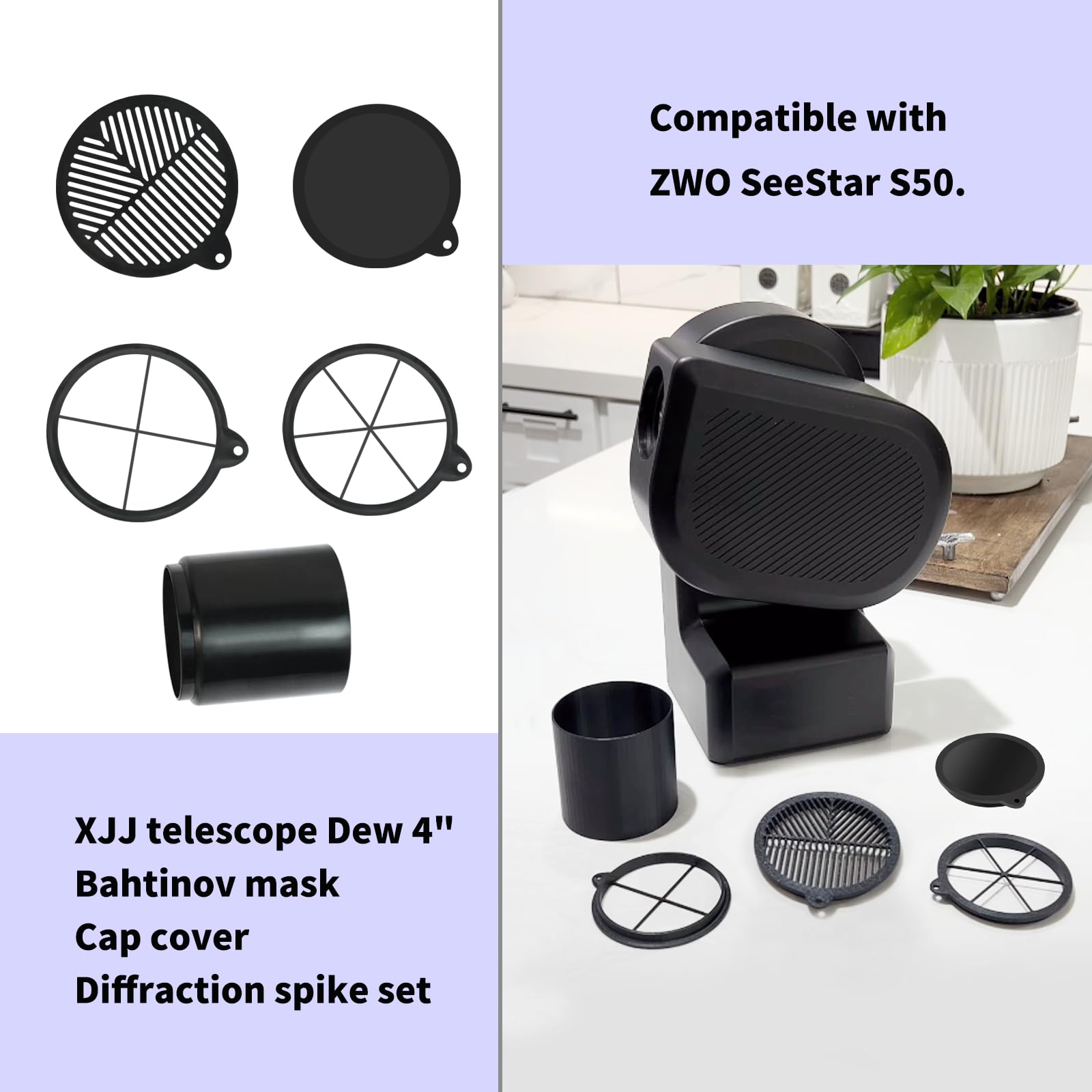 Note: S50 Telescope Dew Shield combination can be directly installed on the telescope lens except Cap Cover, and the rest including Bahtinov mask Diffraction Spike Set need to be combined with Dew Shield