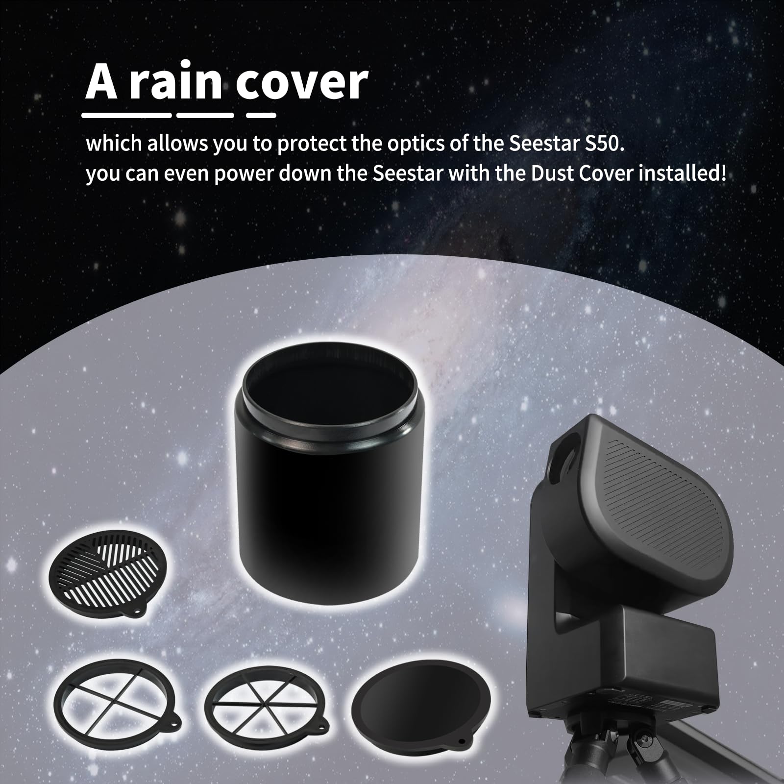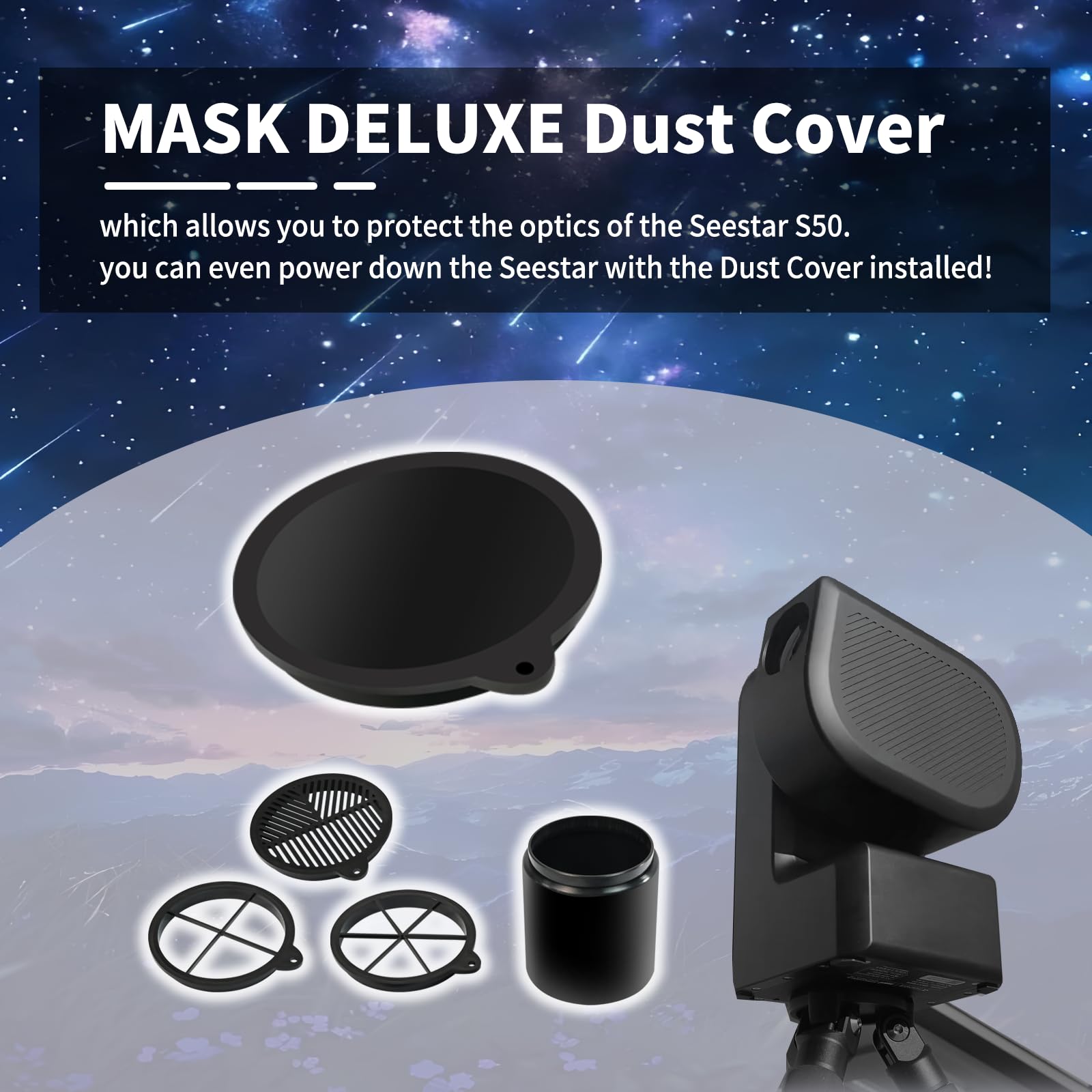 S50 Telescope Dew Shield combination function 2: MASK DELUXE Dust Cover, which allows you to protect the optics of the Seestar S50. And yes, can even power down the Seestar with the Dust Cover installed. A rain cover can prevent your telescope optical system from fogging first. and the design of internal frosting can reduce the refraction of some light,observe for hours with perfect angle