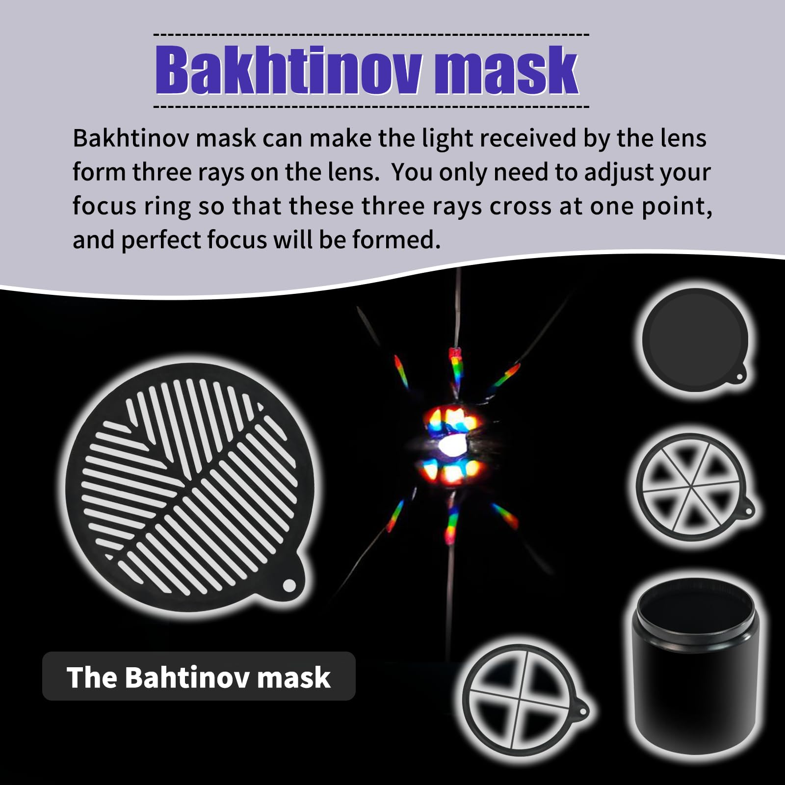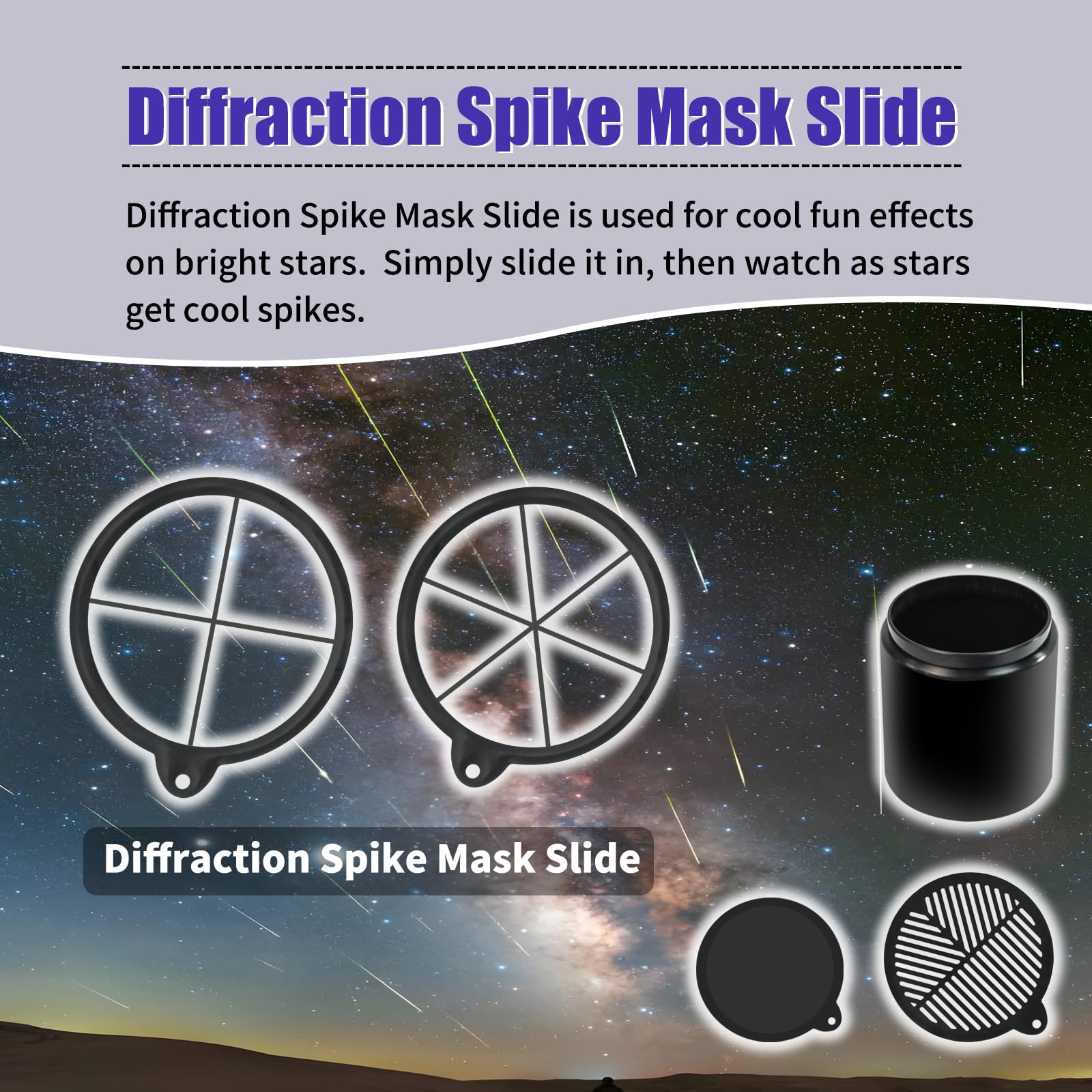 S50 Telescope Dew Shield combination function 1: Bakhtinov mask can make the light received by the lens form three rays on the lens. Only need to adjust your focus ring so that these three rays cross at one point, and perfect focus will be formed.Diffraction Spike Mask Slide is used for cool fun effects on bright stars. Simply slide it in, then watch as stars get cool spikes