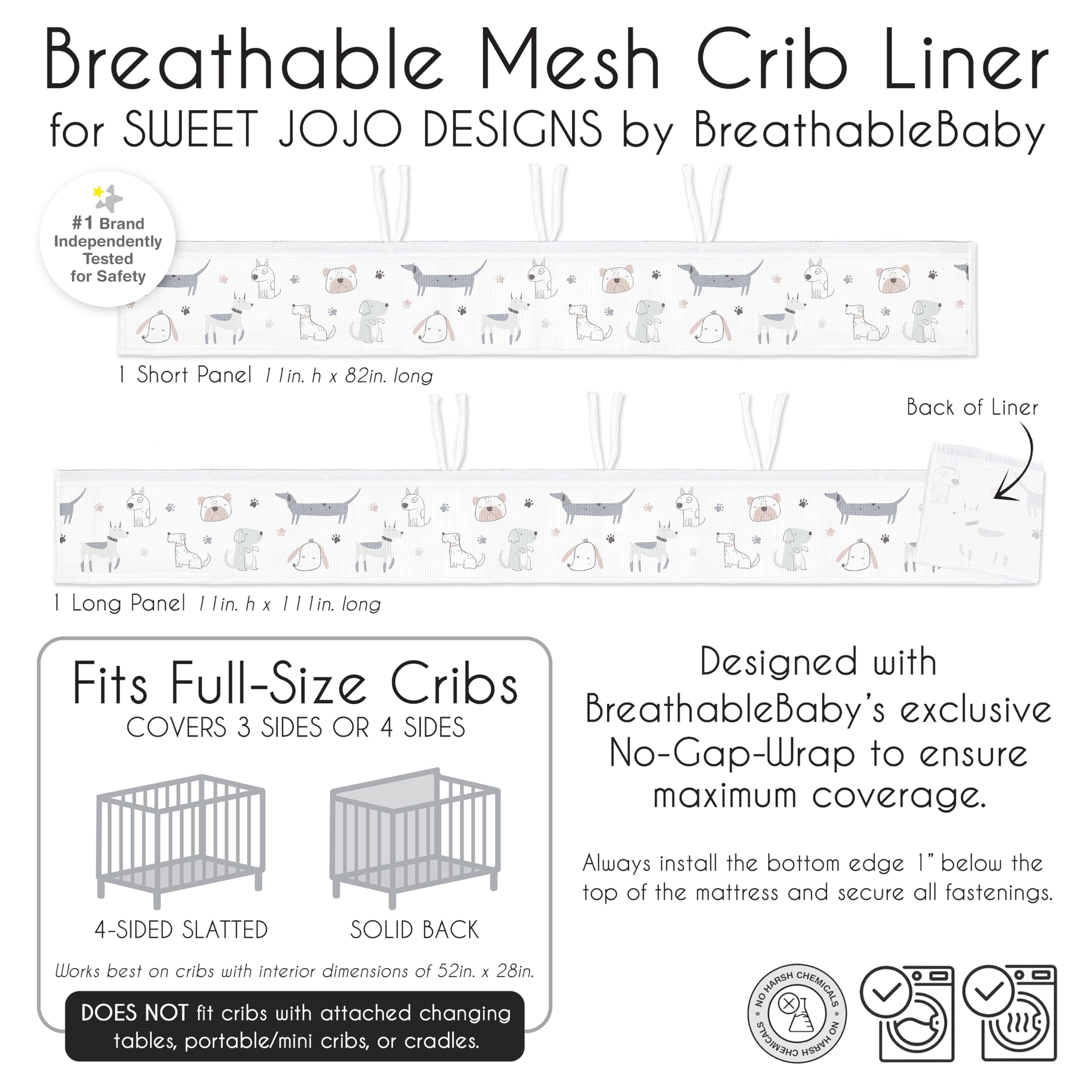 Sweet Jojo Designs + BreathableBaby Mesh Crib Liner Includes: (1) Long Panel Mesh Liner: 11in. x 111in. and (1) Short Panel Mesh Liner: 11in. x 82in. specifically designed for standard crib styles (such as solid back and 4-sided slatted style) sold in North America and incorporates BreathableBaby patented technology with our most popular designs. DOES NOT FIT and should never be used in cribs with attached changing tables, cradles, toddler beds, bassinets, portable/mini cribs or solid end cribs.