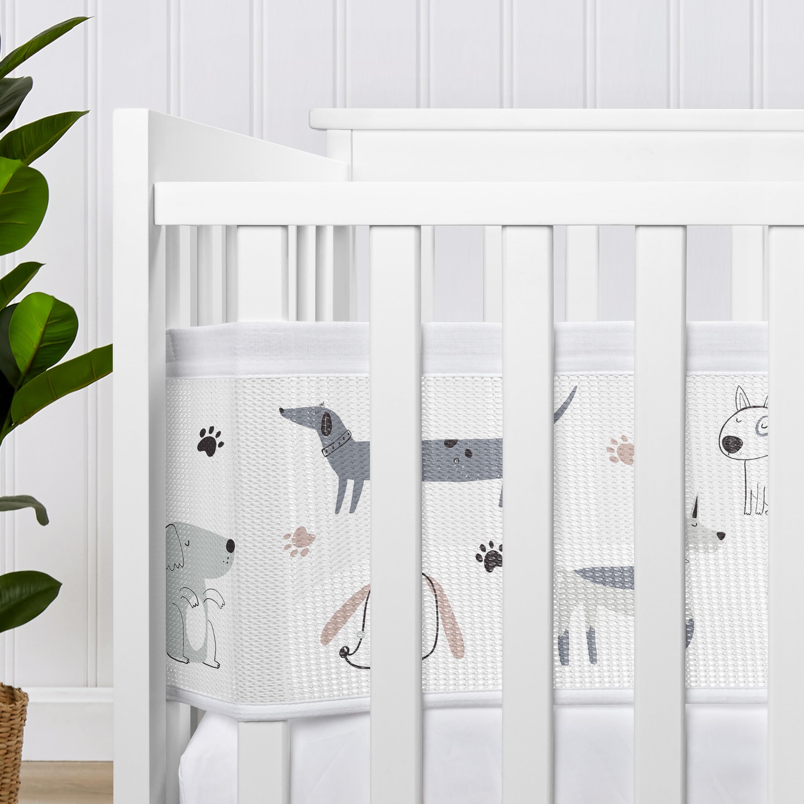 This mesh crib liner features a modern, watercolor, puppy, bulldog, wiener doggy, pet, puppies, dog with complimentary color palette from the matching Sweet Jojo Designs Dog bedding collection of grey, taupe and slate blue.