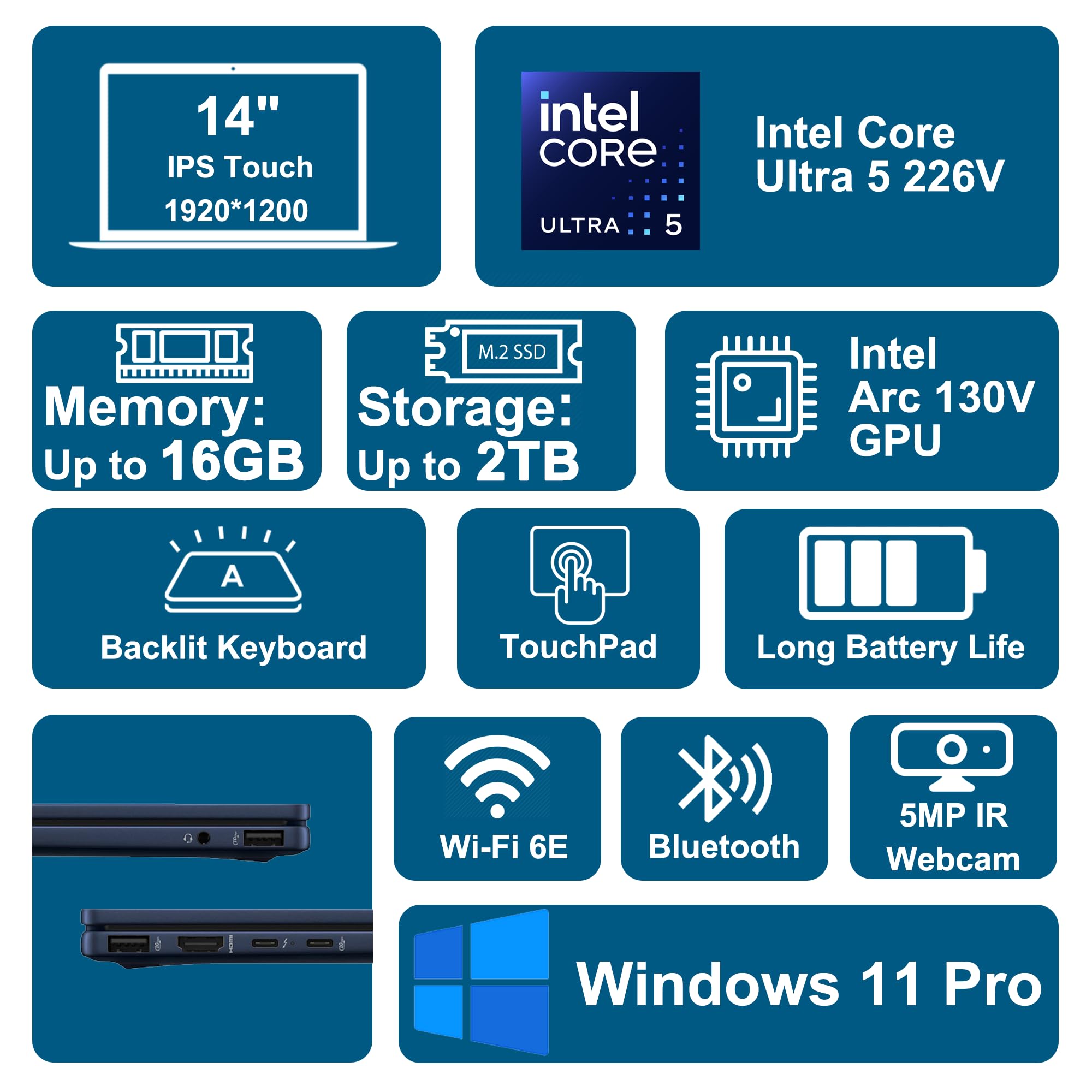 PRODUCT OVERVIEW: Product Details: Microprocessor: Intel 8-core Ultra 5 226V Memory: 16GB RAM Storage: 512GB SSD Operating system: Microsoft Windows 11 Professional Graphics & Video: Integrated Intel Arc 130V GPU 14" WUXGA (1920x1200) IPS Touchscreen (400nits) Key Features: Backlit Keyboard: Yes Poly Studio: Yes DTS:X Ultra: Yes 5MP IR Privacy Camera: Yes Wi-Fi 6E: Yes Ports: 2x SuperSpeed USB-A, 2x SuperSpeed USB-C, 1x HDMI 2.1 Battery: 59Wh Additional Information: Dimension: 8.6" x 12.32" x 0.58" Weight: 3.06 lbs