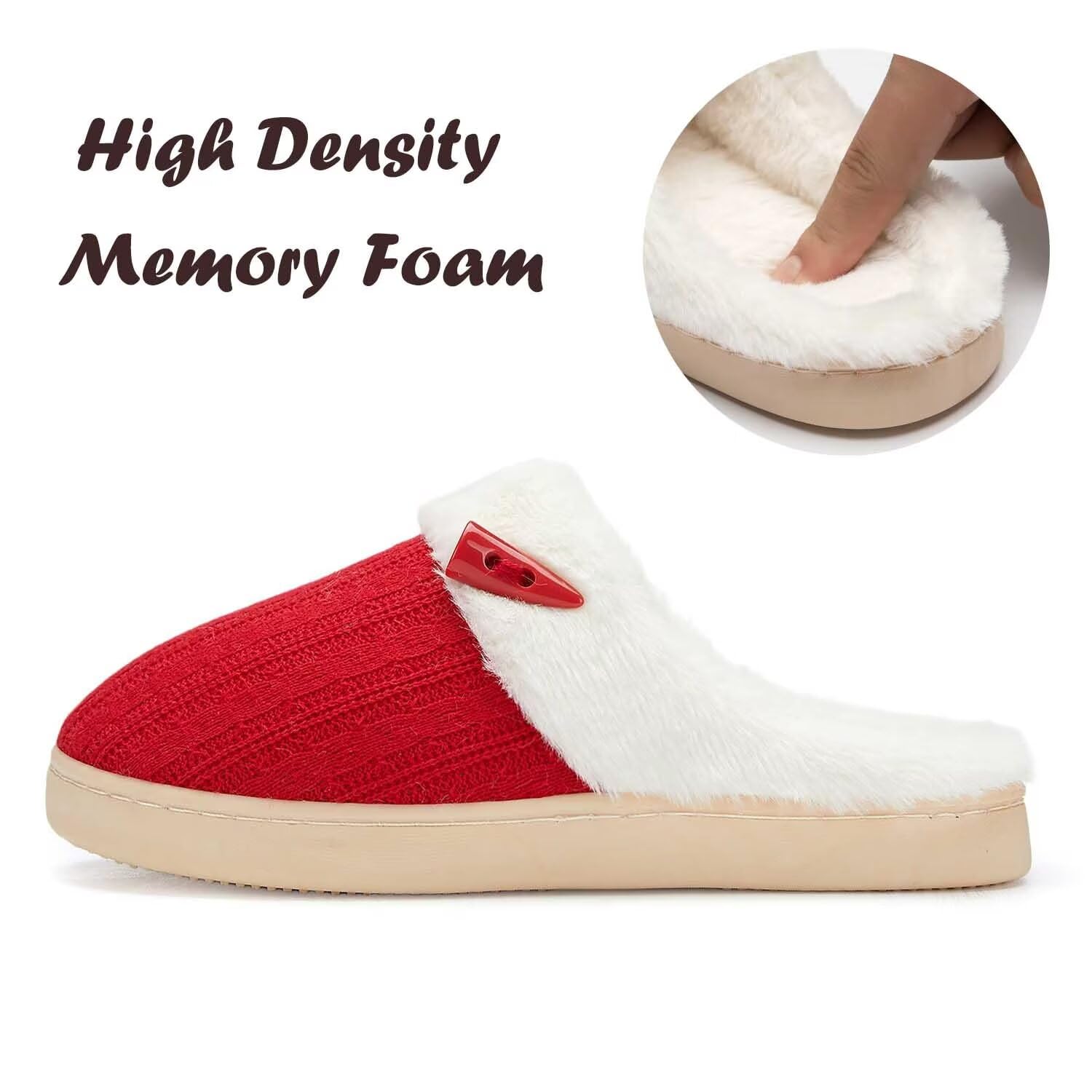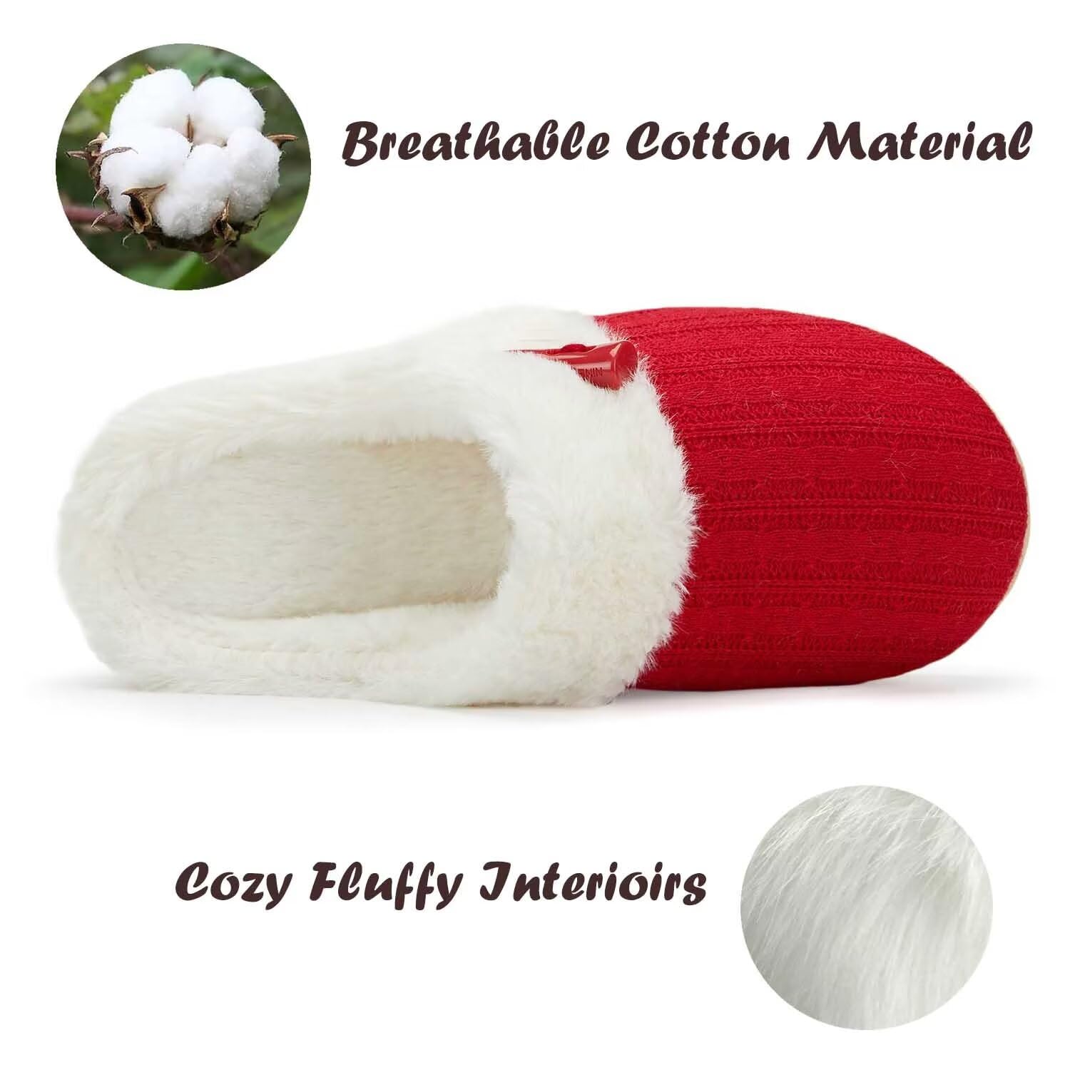 EASY SLIP ON STYLE:Step into comfort easily with these open back fuzzy bedroom slippers that are made with fluffy plush.Soft plush faux fur lining offers superior comfortability from the clouds.Also these comfy house shoes are so chic with knitting upper and horn button design
