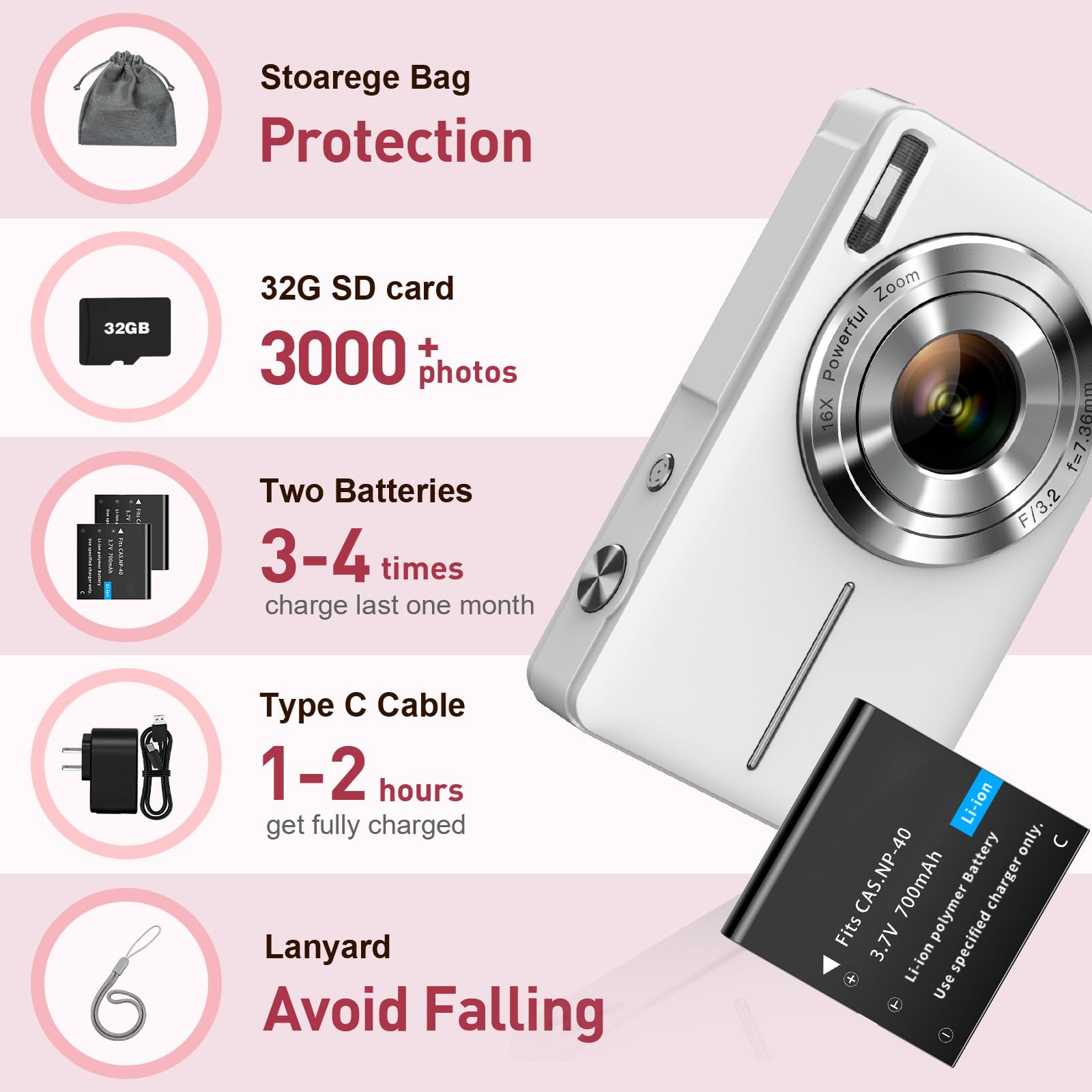 SUPERIOR SUPPORT FOR THIS GIFT - Backed by a one year hassle-free promise- refund and replacement. Digital camera, SD card, lanyard, storage bag, batteries, adapter, cable, exquisite box..., contains everything you need. It is a perfect gift for boys, girls, teens on birthdays, Christmas or any important events, a first real camera for kids who love to take videos and pictures.