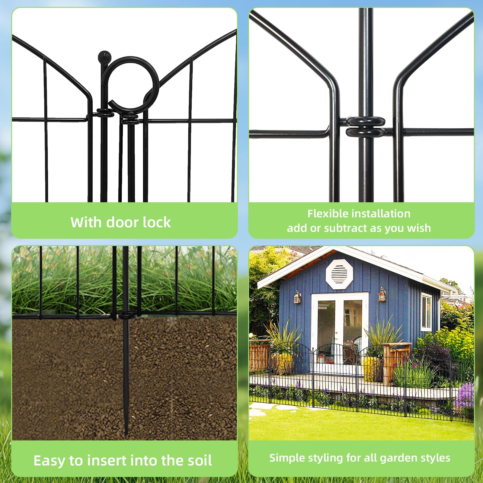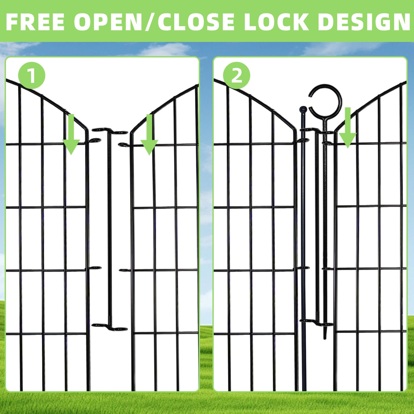 Customizable Size: Our garden fence border comes with 10 panels, each fence panel 29" wide by 40" high, for a total length of 24 ft. The metal fence is also equipped with 11 sturdy 47" metal stakes to securely anchor it to the ground. With 1 lock that turns your fence into a flexible moveable gate.The fence panels are flexible and can be easily extended and customized to fit your specific landscaping needs