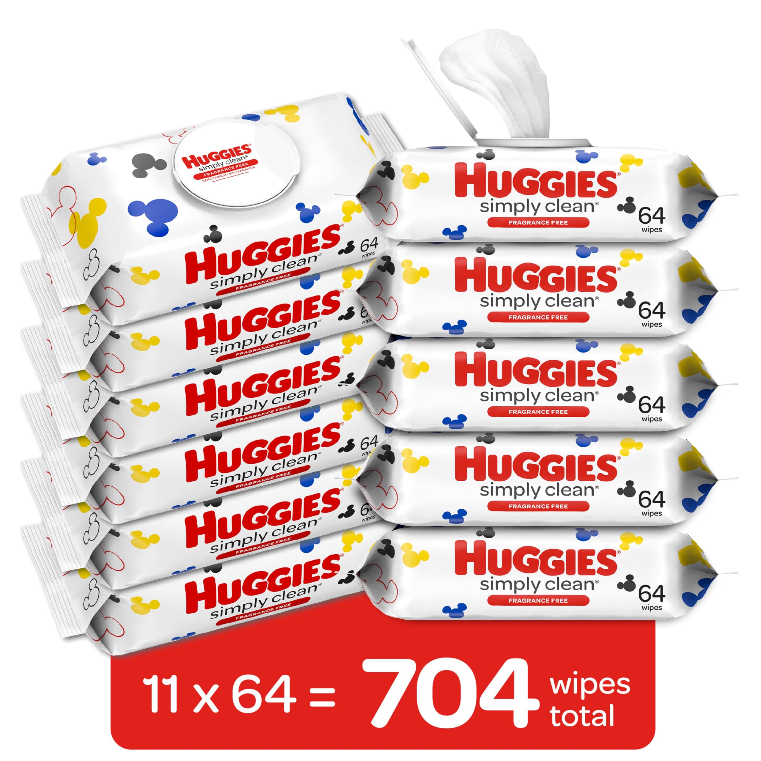 11 flip-top packs of 64 unscented baby wipes (704 wipes total); packaging and lid style may vary