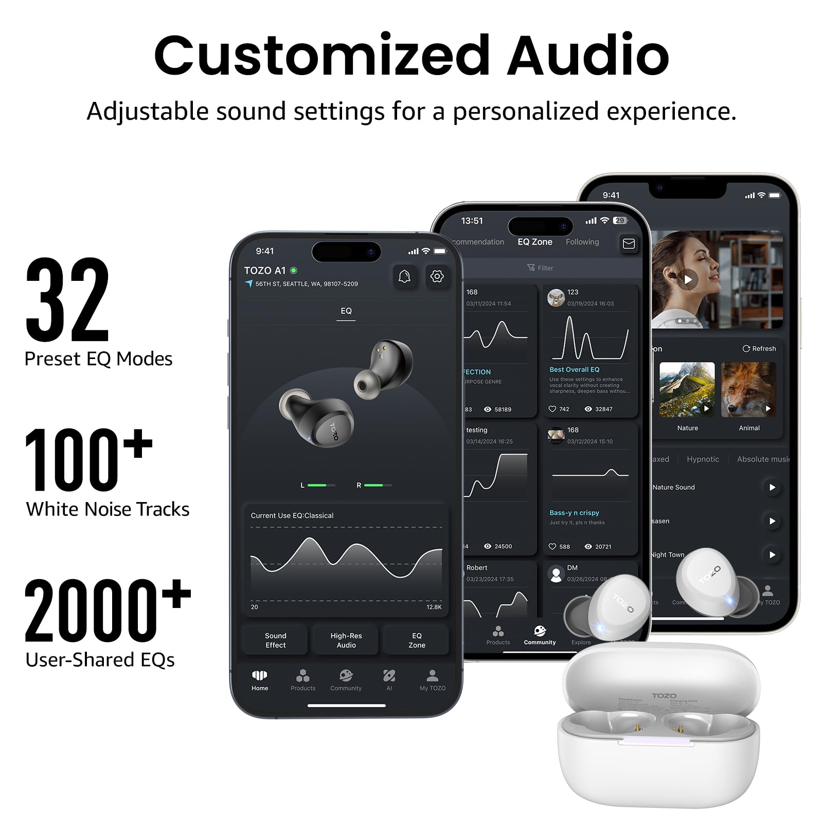 [32 Custom EQ with TOZO App] Use the TOZO app to access 32 EQ presets and adjust bass, vocals, or balanced sound to match your preference.