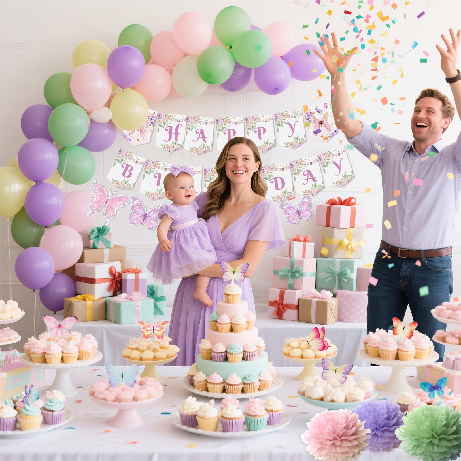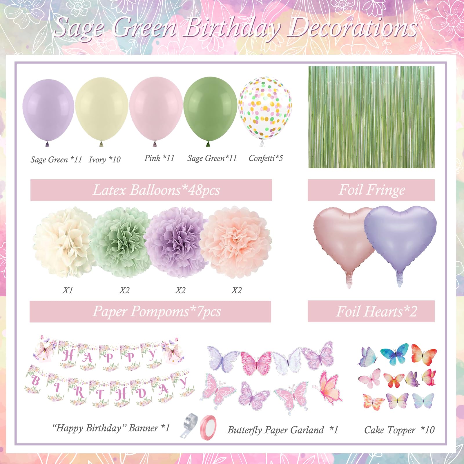 Fairy Birthday Decorations: Happy birthday decoration set includes: purple Balloons*11, avocado green*11, yellow *10, pink*11, sequins*5, butterfly happy birthday sign * 1, butterfly Banner*1, paper pompoms * 7, love balloons * 2, sage green fringe curtains * 1,cake decorations, ribbons, balloon chains.