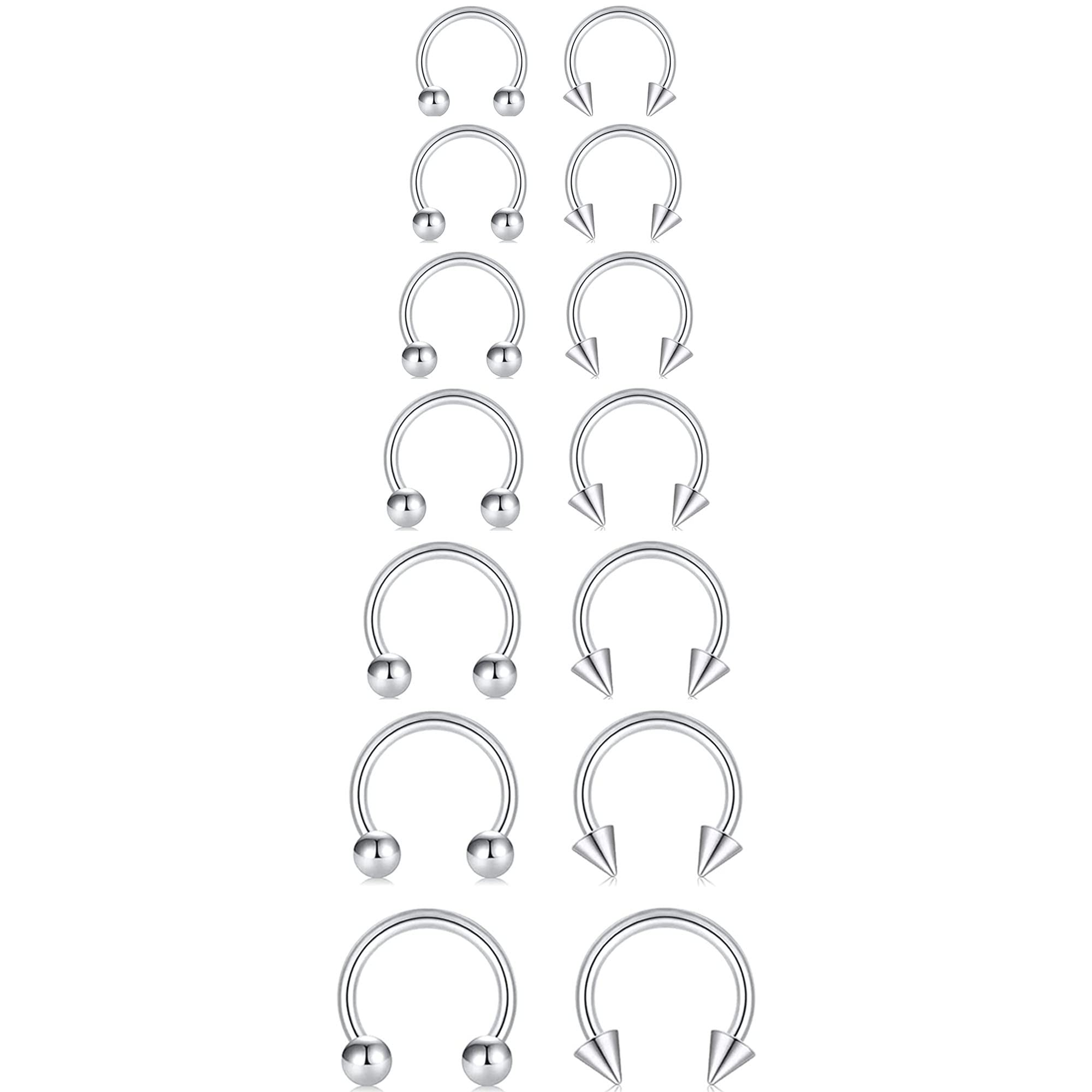 [Total 8pcs Black Horseshoe Hoops] 4pcs horseshoe hoop earrings with balls, 4pcs horseshoe rings with spikes; 20G(0.8mm); Inner diameter: 8mm(5/16") & 10mm (3/8"), ball size: 3mm