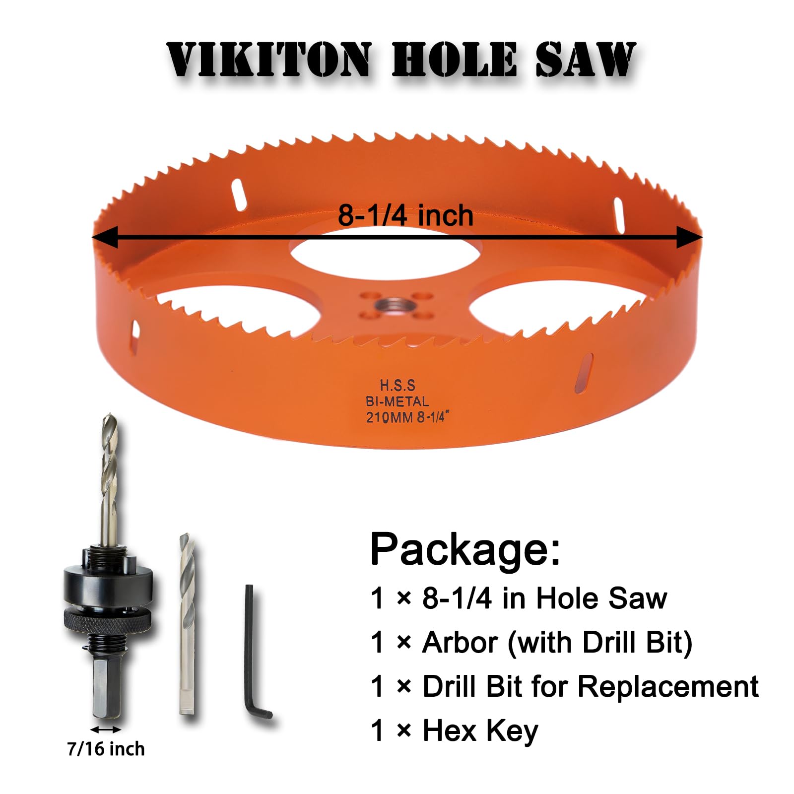 Package Include: 8.25 in hole saw, 1 pc arbor(with 1 drill bit), 1 pc drill bit for replacement, 1 pc hex key