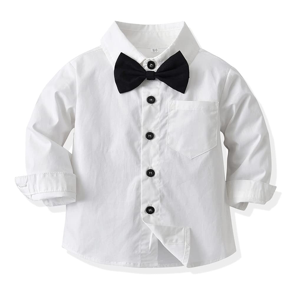XMAS CHRISTMAS GIFT FOR BOYS: Baby boys Christmas Santa snowman romper shirt suspender pants formal wedding suit, a matching pre-tied bowtie, printed with snowman and snowflake, designed with a bowknot and elastic band, easy to wear. A best gift for your little boys. Long sleeve classic plaid striped buttons shirt tops, macthing with suspender elastic waist trousers. 4pcs formal casual suit, necessities in the baby's closet.