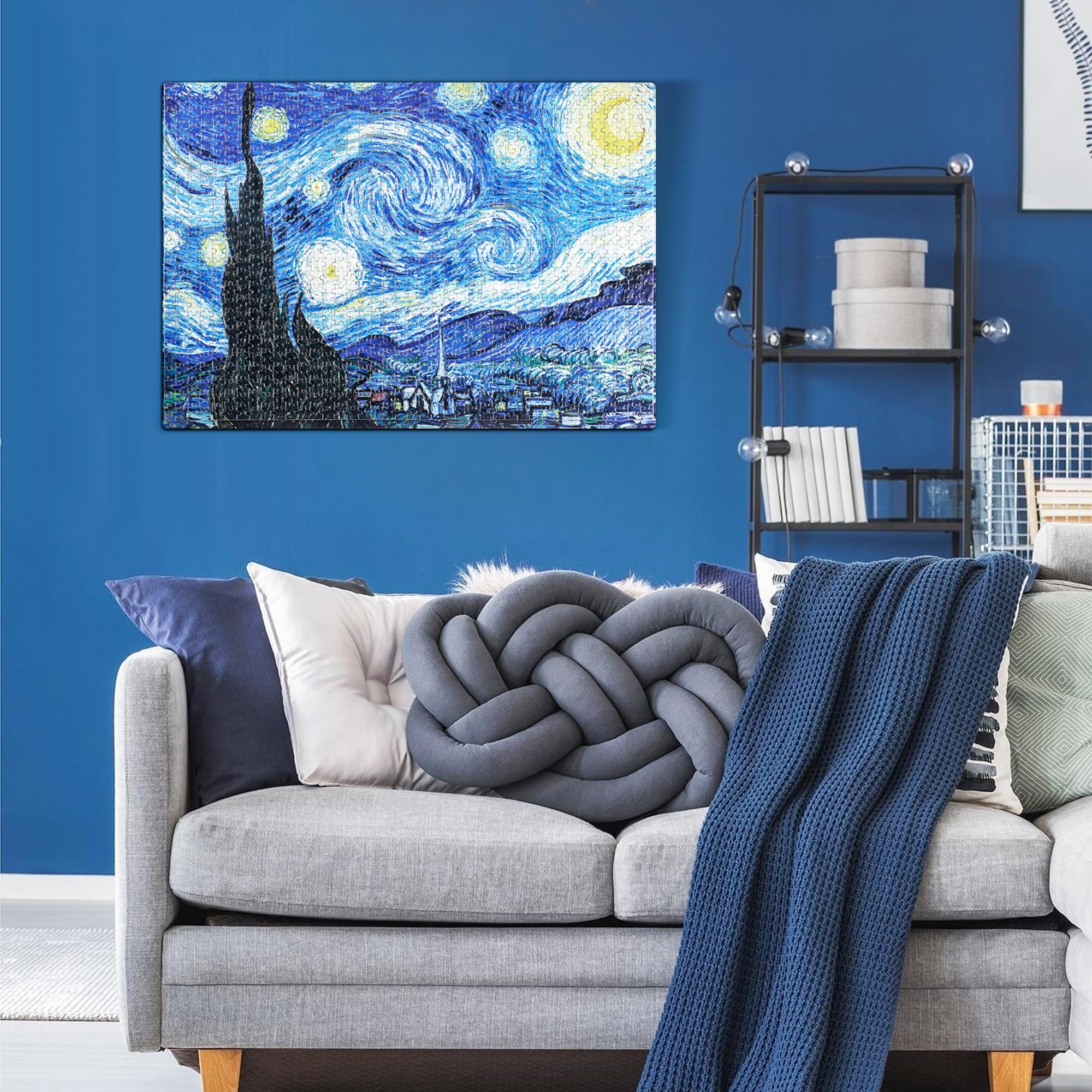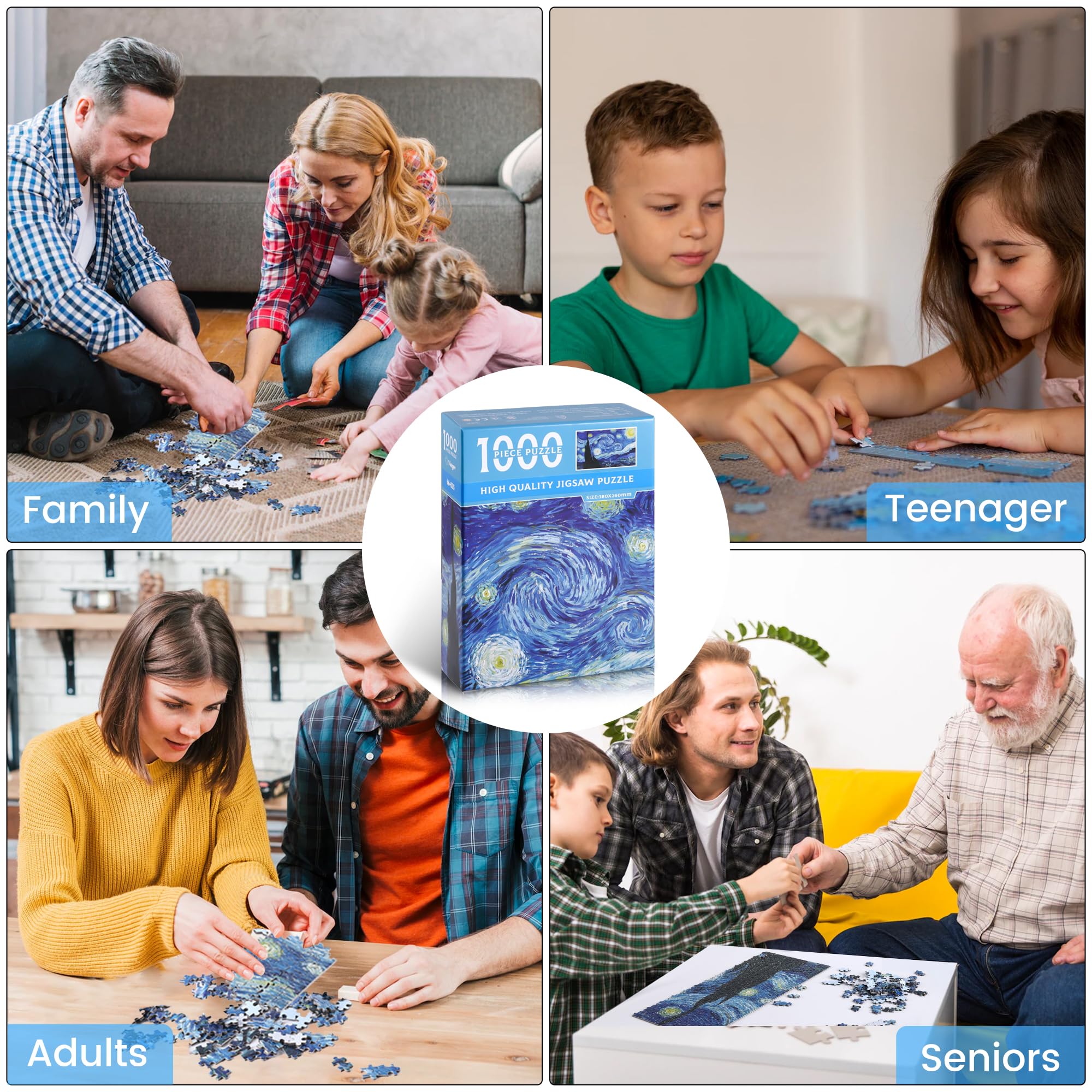 【Great Material and Contents】--The puzzle of 'The Starry Night' contains 1000 pieces puzzles and a poster. Finished size are: 70*50cm/27.6''x 19.7''. High quality recycled cardboard, sturdy and bend-resistant. Special surface film treatment, color remains freshness after long time storage.